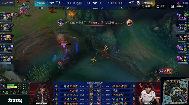直播吧1月23日讯2026年LCK杯继续进行中,今天的首场比赛是焦点对局,经典的“通讯社大战”:T1对阵KT!!