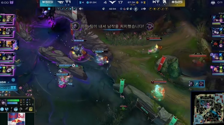 [42:20]大龙第四次刷新,高地团2V2,Bdd阿卡丽后金身白给了!T1拿下大龙但是KT集火强杀掉了Doran亚恒!这波KT随后拿下第二条远古龙!