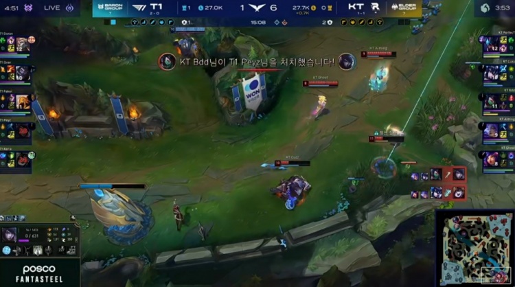 [15:08]T1下路组猛吃镀层结果被KT中野绕后强开!KT人数优势四人直接越塔又一次击杀掉了T1下路组!打出0换2!T1在上下两路都拆掉一塔!KT拿下先锋!