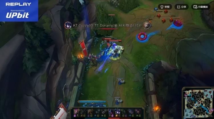 [3:45]Cuzz猪妹gank上路,配合PerfecT雷克塞双人跟闪,成功击杀掉了Doran亚恒!一血给到Cuzz猪妹!