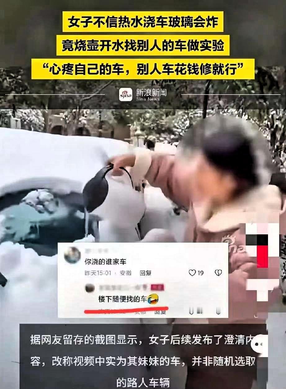 脸都不要了!近日安徽,一女子不相信网上说的开水浇车窗会炸,竟烧了壶热水,找别人的车做实验,这哪里是求证,分明是漠视他人财物的不妥行为。 大冷天的,小区里的私家车玻璃上积着厚厚的雪,温度肯定低得厉害。她随手挑了一辆车,直接把开水浇在挡风玻璃上,伴随着几声清脆的“咔嚓”声,好好的玻璃当场裂出了好几道缝隙。换作一般人闯了这样的祸,早就慌着联系车主处理,她却举着手机慢悠悠拍视频,嘴里还念叨着“是哪炸了”,全程没有一点愧疚的样子。 这段视频被她发到网上后,网友们一下子就炸了锅,纷纷质问她为什么不用自己的车做实验。没想到她非但没有悔意,还理直气壮地回复:“自己的车心疼钱心疼车,别人的车花钱就能解决。”这话实在让人难以认同,别人的车也是辛苦赚钱买来的,凭什么要成为她满足好奇心的代价? 眼看网上的骂声越来越大,她才赶紧删掉原视频,又改口说那辆车其实是她妹妹的。这种说法实在缺乏说服力,真要是自家亲戚的车,一开始拍视频时怎么不直接说清楚,分明是被网友指责后,想找个借口推卸责任。 冬季低温环境下,车窗玻璃遭遇开水骤热容易炸裂,本就是生活里的基本常识。她非要用别人的财物来验证,说到底就是自私自利的心态在作祟。就算最后按价赔偿,换上去的玻璃也不是原厂的,不仅影响车辆美观,还可能给行车安全留下隐患,车主心里肯定会不舒服。 有钱赔偿从来不是肆意妄为的理由,尊重他人财物才是成年人最基本的教养。这种把自己的好奇心建立在别人损失之上的行为,实在不值得提倡。