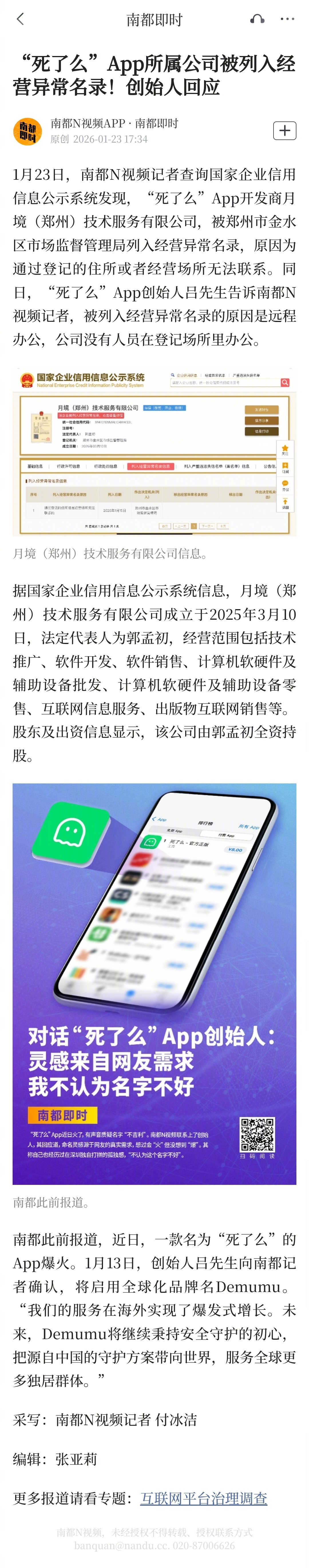 #死了么App所属公司被列入经营异常名录#【“死了么”App所属公司被列入经营异常名录!创始人回应】#创始人回应死了么App所属公司被列入经营异常名录#1月23日,南都N视频记者查询国家企业信用信息公示系统发现,“死了么”App开发商月境(郑州)技术服务有限公司,被郑州市金水区市场监督管理局列入经营异常名录,原因为通过登记的住所或者经营场所无法联系。同日,“死了么”App创始人吕先生告诉南都N视频记者,被列入经营异常名录的原因是远程办公,公司没有人员在登记场所里办公。据国家企业信用信息公示系统信息,月境(郑州)技术服务有限公司成立于2025年3月10日,法定代表人为郭孟初,经营范围包括技术推广、软件开发、软件销售、计算机软硬件及辅助设备批发、计算机软硬件及辅助设备零售、互联网信息服务、出版物互联网销售等。股东及出资信息显示,该公司由郭孟初全资持股。南都此前报道,近日,一款名为“死了么”的App爆火。1月13日,创始人吕先生向南都记者确认,将启用全球化品牌名Demumu。“我们的服务在海外实现了爆发式增长。未来,Demumu将继续秉持安全守护的初心,把源自中国的守护方案带向世界,服务全球更多独居群体。”采写:南都N视频记者 付冰洁