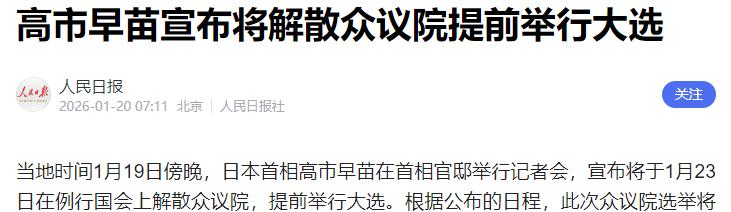 高市早苗宣布提前大选,日本发现新问题:中国不同意派遣外交官 当地时间 1 月 23 日,日本首相高市早苗突然宣布解散众议院提前大选的消息,把日本政坛搅得鸡飞狗跳。可就在她忙着给自己 “巩固政权” 造势时,日媒突然发现一个扎心的现实:中日关系的寒冰压根没化,不仅日本经济代表团本月的访华计划黄了,连派个外交官到中国都被卡住了脖子。 按照日程,1月27日才发布选举公告,2月8日进行投票,从解散众议院到最终投票仅间隔16天,创下二战后日本大选最短周期纪录。 高市早苗之所以敢搞这种“超短期决战”,核心就是想打在野党一个措手不及——毕竟在野党刚完成仓促整合,立宪民主党和公明党才凑成“中道改革联合”新党,还没来得及理顺内部立场。 她目前还有70%左右的内阁支持率加持,想趁着民意尚可,一举打破当前执政联盟的弱势局面。 现在的日本执政党,日子其实并不好过。自民党在众议院仅占199席,加上盟友维新会的席位才刚过半数,稍微有点风吹草动就可能丢了执政权。 而且公明党此前的“临阵倒戈”,让自民党不得不对维新会妥协让步,对方不参与内阁决策却要拿足好处,这让高市早苗的右翼激进政策处处受限,不管是修改“安保三文件”还是松动“无核三原则”,都遭到在野党强烈抵制。 这次提前大选,她就是想赌一把,争取自民党单独过半席位,既摆脱对盟友的依赖,又能甩开党内大佬的掣肘,彻底放开手脚推行自己的政治路线。 为了加码这场豪赌,高市早苗甚至放出狠话,要是执政联盟没能在大选中拿到多数席位,她就主动辞职。 可这份决绝背后,是越来越大的国内争议。超过半数日本民众反对这次仓促大选,最担心的就是2026年度预算案赶不上3月底前通过,直接影响地方财政和民生补贴发放。 连自民党内都有不满声音,她严守解散秘密,连幕后支持者麻生太郎都没提前告知,干事长更是从新闻里才得知消息,这种独断专行的做法,已经埋下了党内分裂的隐患。 就在高市早苗一门心思扑在大选造势上时,日媒却揪出了一个更棘手的外部难题——中日外交的僵局比想象中更严重。 一个看似不起眼的岗位,暴露了双方关系的真实温度:日本驻重庆总领事自去年12月离任后,空缺至今已有一个多月。按照外交惯例,新人选两周左右就能走完审批流程到岗,可日本方面递交人选后,中方始终没有点头,这件事就这么悬了下来。 面对追问,中方发言人只回应“正按程序处理有关事宜”,没有否定也没有放行,这种不疾不徐的态度,反倒让日本政府陷入尴尬。 日本官房长官被问及时,只能绕开关键问题避而不答,既说清审批进度,也不愿透露候选人背景,仿佛这事和自己无关。 让日本焦虑的是,原定1月底访华的经济代表团行程也悄然取消,理由同样是中方没有给出明确安排,等于经贸沟通的渠道也暂时卡了壳。 其实这不是中方故意“卡脖子”,而是日本的外交姿态本身就充满矛盾。一边喊着要和中国恢复经贸合作,想靠着访华代表团缓解国内经济压力;另一边,高市早苗政府却反复抛出“台湾有事就是日本有事”的强硬言论,在涉华核心利益问题上不断挑衅。 这种“既要又要”的心态,根本谈不上外交诚意,中日关系的寒冰,本质上就是日本右翼政府错误言行累积的结果。 这个空着的总领事岗位,更像一面镜子,照出了日本外交的尴尬:想恢复接触,却不愿纠正自身错误;想营造受害者形象,又没法自圆其说自己的挑衅行为。 如今的局面,其实都在中方的观望之中。高市早苗的提前大选,意味着日本首相位置存在变数,在2月8日选举结果出炉前,中方大概率不会追加对日本的制裁,但也绝不会在外交官任命这种事上松口。 毕竟要是高市早苗成功连任,以她的右翼立场,只会继续强化对华强硬政策,中日关系缓和无从谈起,这个领事岗位自然会继续空缺;可要是大选出现反转,新政府能拿出务实的对华态度,双方才有重新沟通的基础。 高市早苗的这场政治豪赌,不仅关乎她自己的首相宝座,更牵动着中日关系的走向。对日本而言,眼下最该想的不是怎么靠大选巩固权力,而是如何拿出真正的诚意打破外交僵局。 经贸合作离不开良好的政治氛围,外交官到位更需要双方的相互信任,要是始终抱着挑衅的心态,只会让自己陷入地缘孤立的困境。这场16天的大选闪电战终会落幕,但中日关系要解冻,还需要日本拿出比“政治算计”更实在的行动。
