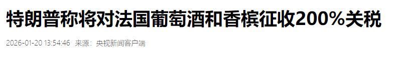 特朗普通告全球,将对法国加税200%,不到24小时,马克龙喊话中方 特朗普和马克龙杠上了!面对特朗普的胡搅蛮缠,法国先是联合欧洲七国军演反抗特朗普“买格陵兰岛”,又是直接拒绝“加沙和平委员会”的入会邀请。 特朗普见马克龙两次不给他面子,恼羞成怒要制裁法国,于深夜宣布将对法国的葡萄酒与香槟加征200%的关税。 美欧关系恶化,马克龙只得另寻出路,有一个比美国更稳定、更讲理的合作伙伴:中国。 特朗普抛出了所谓的加沙“和平委员会”,自任主席还向六十多个国家发出邀请,明眼人都能看出,这不过是美国想掌控加沙战后治理、架空联合国的工具。 马克龙选择拒绝,法国官方明确表态,担心该委员会权力过大,超出加沙治理范围,严重违背《联合国宪章》原则,甚至点出委员会章程赋予特朗普一票否决权等不合理条款,直接戳破了美国“和平”外衣下的霸权野心。 连续被“打脸”,特朗普彻底恼了。当地时间1月19日深夜,他在返回华盛顿的专机上对着媒体放话,要对法国葡萄酒和香槟加征200%的关税,还放狠话“只要加税,马克龙就会加入委员会”。 这话里的威胁意味不言而喻,要知道葡萄酒和香槟是法国的支柱出口产业,常年占据全球高端市场,一旦被加征如此高额的关税,法国酿酒业将遭受毁灭性打击,无数从业者会面临失业危机。特朗普显然是算准了这一点,想用经济胁迫逼马克龙低头。 特朗普的蛮横操作,让原本就紧张的美欧关系雪上加霜。欧洲多国外交官私下都在吐槽美国政策“疯狂失控”,马克龙、冯德莱恩等欧洲领导人甚至建了专属群聊,专门应对特朗普的极端外交手段。 法国当然不会坐以待毙,马克龙先是表态要启动欧盟反胁迫工具,准备针对性反制,紧接着在不到24小时后,就把目光投向了东方。 1月20日的达沃斯世界经济论坛上,戴着墨镜、尽显强硬姿态的马克龙,发表了一场火药味十足的演讲。 他开篇就直指美国,痛斥当下世界规则被践踏,“帝国主义野心”死灰复燃,批评美国用关税作为侵犯他国主权的工具,直言这种做法完全不可接受。 骂完美国后,他话锋一转,主动向中方释放信号,称欢迎中国加大对欧直接投资,还点名希望在电动汽车、电池、新能源等领域开展合作。 马克龙的这番表态,看似是示好,实则藏着欧洲的无奈与算计。一方面,法国乃至欧洲经济复苏乏力,制造业外流、失业率高企,而中国在新能源、高端制造领域的技术和产业链优势,正是欧洲急需的。 另一方面,被美国反复拿捏后,马克龙想通过拉拢中国,在中美之间争取更多回旋空间,推动欧洲战略自主,不再受美国牵制。 但他的诉求又带着明显的矛盾,一边呼吁中国投资,一边又附加条件,要求投资必须带来技术转移、符合欧洲标准,甚至暗指中国贸易“不公”,这种既想要又设防的心态,暴露了欧洲的纠结。 面对马克龙这种复杂的“示好”,中方的回应既理性又坚定。1月21日,外交部发言人郭嘉昆在例行记者会上明确表示,中欧经贸关系的本质是优势互补、互利共赢。 中国产品的竞争力源于科研投入、市场竞争和完整产业链,而非所谓补贴,中方也鼓励企业赴欧投资,但前提是欧方要提供公平、非歧视的市场环境。这番话直接点透了核心:合作可以,但必须平等相待,不能搞双重标准。 如今这场美法博弈还在持续,马克龙拒绝与特朗普在达沃斯会面,用行动表明了态度,而欧盟也在酝酿对美反制措施。 说到底,特朗普的关税威胁终究是霸权逻辑的体现,想靠施压让盟友妥协,只会不断消耗美国的信誉。 而马克龙转向中方,本质上是全球多极化趋势下的必然选择,当美国不再可靠,寻找稳定、讲理的合作伙伴成为必然。中欧合作的基础是互利共赢,而非单方面的诉求,这一点马克龙显然需要看得更清楚。 未来美欧关系如何修复、中欧合作能否突破阻碍,关键还要看各方是否愿意放下偏见,回归规则本身。毕竟在全球化时代,靠霸凌行不通,唯有平等合作才能走得更远。