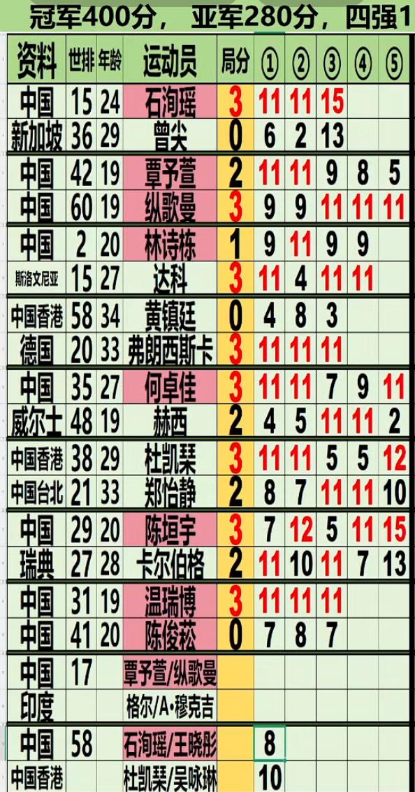 陈垣宇3:2险胜安东卡尔伯格 晋级男单半决赛——逆转6个赛点惊心动魄 7:11,12:10,5:11,11:7,15:13 陈垣宇的这场比赛太让人揪心, 决胜局10:9六个赛点拿下比赛, 有惊无险的一场比赛, 好在结局是好的! 男单半决赛的对阵, 陈垣宇VS弗朗西斯卡 温瑞博VS达科, 希望陈垣宇 温瑞博会师决赛, 温瑞博绝对是一匹黑马, 这次比赛如果再次夺冠, 一定超向鹏, 超周启豪, 超陈垣宇也是时间问题!