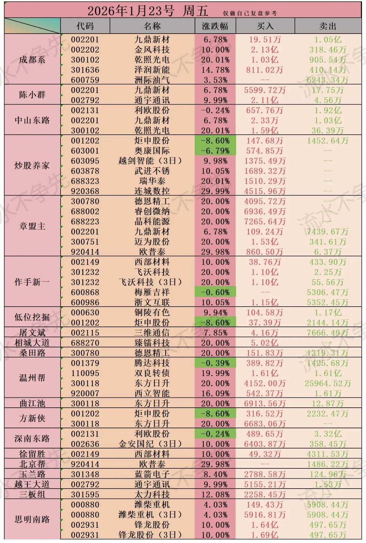 2026年1月23日龙虎榜股票交易数据一览,涨跌幅度、买入卖出情况一目了然! 股市复盘:九鼎新材、金风科技等个股异动,游资活跃,章盟主、炒股养家现身多股交易
