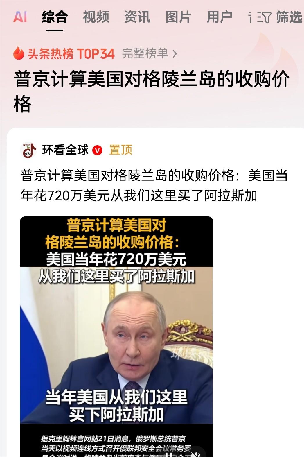 普京完全就是看热闹不嫌事大,格陵兰岛的局势本身就已经很紧张了,他又泼了两桶汽油。 莫斯科当地时间1月21日,俄罗斯总统普京在一次安全会议上提到了美国收购格陵兰岛的新闻。 他对着摄像机,并没有直接表明支持或者反对的态度。 却慢慢悠悠地谈到了过去的历史。 说沙皇俄国当年把阿拉斯加卖给美国才 720 万美元,按通货膨胀算到现在也就 1.58 亿美元。这话听着像是随口聊历史,实则满肚子 “坏水”,每一个字都在拱火! 咱们先说说这笔账,有人按黄金价格算,当年 720 万美元能买 11 吨黄金,放到现在值 4.4 亿美元,按莫斯科超市的牛肉价格算,1838 年 1 卢布能买 3 公斤多牛肉,现在得 500 多卢布,这笔账更是高达 187 亿卢布。 但普京偏偏挑了个 1.58 亿美元的算法,就是故意把当年的交易说得轻飘飘,暗示领土买卖这事在历史上有先例,而且成本没那么高。 这话说出来,直接就戳中了各方的痛处。对丹麦来说,这简直是赤裸裸的提醒,你看美国当年能从俄国手里买阿拉斯加,现在就敢打格陵兰岛的主意,你丹麦能不能保住这块地还两说呢! 要知道丹麦当年也把维尔京群岛卖给过美国,普京这话一出口,等于在丹麦心上扎了一刀,让他们更紧张美国的野心。 对美国来说,普京这话看似认可了领土买卖的合理性,实则是把美国的狼子野心摆到了台面上,让全世界都看看,美国就是想通过这种方式扩张,之前说的 “应对俄罗斯威胁” 全是借口。 而对格陵兰岛自治政府来说,这更是在动摇他们的立场,让他们觉得自己的命运可能就是被当成交易品,心里能不打鼓吗? 普京这么做,根本就是看热闹不嫌事大,他心里比谁都清楚格陵兰岛对北极博弈的重要性,俄罗斯自己也在卯足了劲开发北极,现在已经有 8 艘核动力破冰船,还在造更强的型号,计划到 2035 年让北极航道的货运量从 3350 万吨涨到 2.7 亿吨,把这里打造成国际运输大动脉。 格陵兰岛就在北极航道的关键位置,美国要是真控制了这里,俄罗斯的北极计划就得受影响,所以普京才故意抛出历史话题,搅乱美丹关系,让他们互相猜忌、内斗,自己好坐收渔翁之利。 你想想,本来美丹之间就因为美国的小动作心存芥蒂,欧洲各国也对美国的 “美国优先” 政策不满,马克龙之前就公开怼过美国,说欧洲不会屈服。 普京这时候提阿拉斯加的旧事,就是要放大这种矛盾,让欧洲觉得美国不可靠,让丹麦对美国更加警惕,这样一来,美国想在格陵兰岛搞动作就会遇到更多阻力,俄罗斯在北极的压力自然就小了。 这招实在太鸡贼了,表面上事不关己,实则每一步都算得明明白白,就是要让格陵兰岛的局势更紧张,让各方都顾不上针对俄罗斯。 而且普京说的 1.58 亿美元这个数,本身就很有争议,不同的计算方式得出的结果天差地别,但他偏偏选了这个相对较低的数字,就是要让这个话题更有讨论度,让更多人关注格陵兰岛的归属问题,把水搅得更浑。 本来大家可能还在观望,他这么一说,媒体争相报道,各国不得不站出来表态,局势自然就升级了。 格陵兰岛的局势本来就够复杂了,美国、丹麦、欧洲、俄罗斯各方势力盘根错节,资源和战略利益的争夺已经让这里暗流涌动,普京这一番看似漫不经心的历史回顾,直接点燃了各方的情绪,让原本就紧张的关系雪上加霜。 他根本不是在谈历史,而是在利用历史制造矛盾,就是想看美欧之间闹得更凶,自己好从中渔利,这不是看热闹不嫌事大是什么? 分明就是精准拱火,把两桶汽油泼得又准又狠,让格陵兰岛这个火药桶随时都有爆炸的可能。 现在好了,普京这话一说完,美丹之间的信任又少了几分,欧洲对美国的警惕又多了一层,格陵兰岛自治政府也得重新考量自己的立场,各方互相猜忌、互相提防,局势比之前紧张了不止一个档次。 不得不说,普京这手腕真是够厉害的,一句话就能搅动全局,把 “看热闹不嫌事大” 发挥到了极致,格陵兰岛这摊浑水,被他这么一搅,短期内是别想平静下来了。