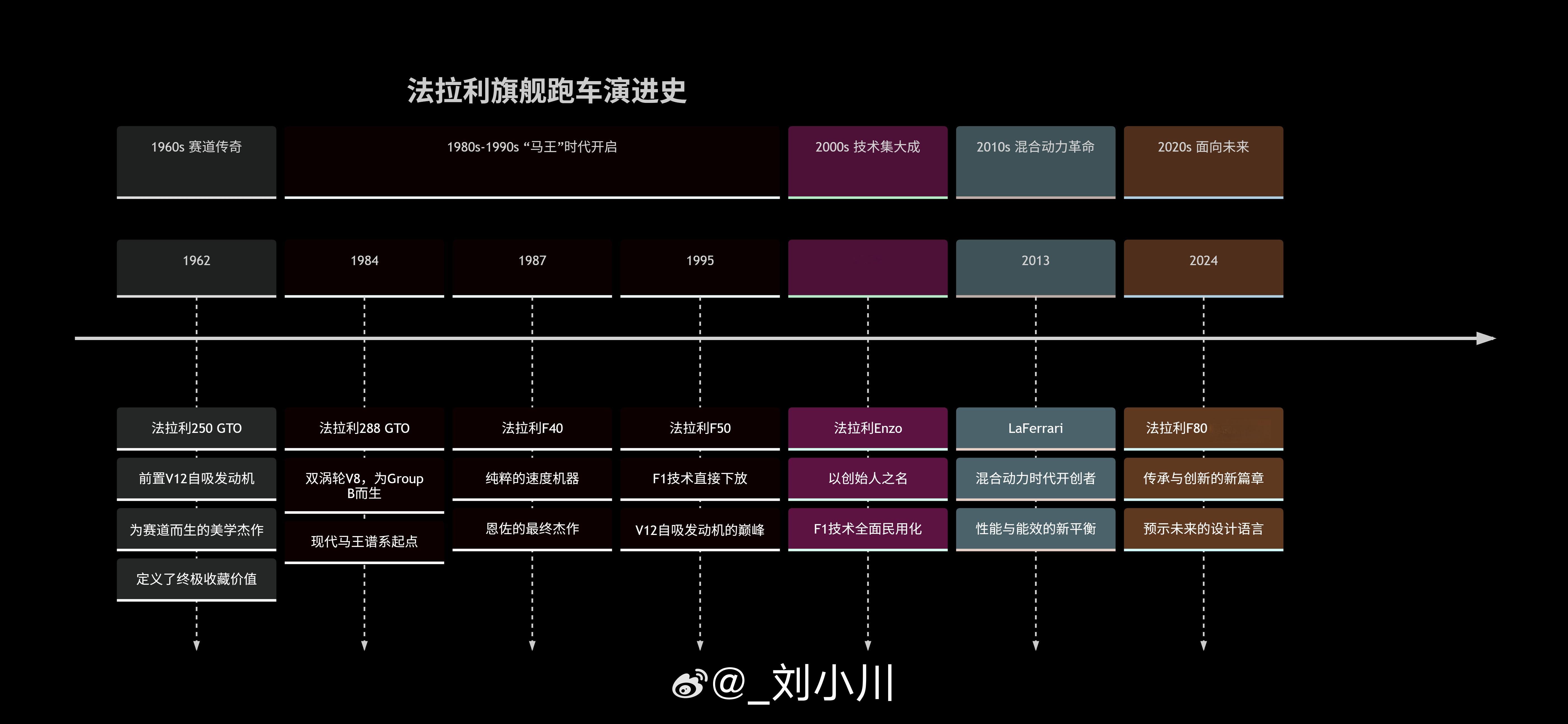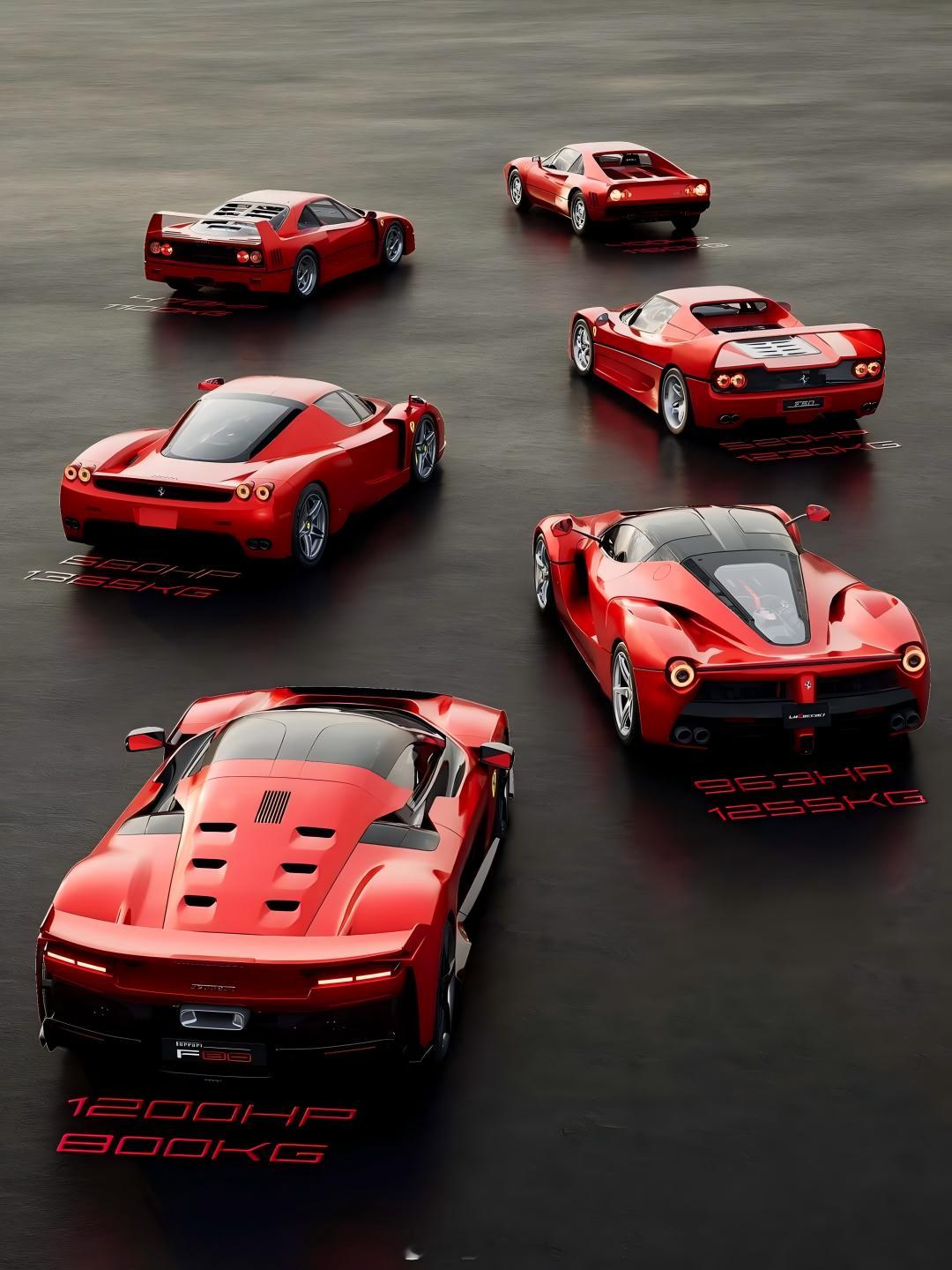法拉利旗舰跑车演进史 法拉利旗舰跑车演进史:1.法拉利288 GTO (1984-1986),现代马王谱系起点;2.法拉利F40 (1987-1992),恩佐的最终杰作;3.法拉利F50 (1995-1997) ,V12自吸发动机的巅峰;4.法拉利Enzo (2002-2004),F1技术全面民用化;5.LaFerrari (2013-2016) - 混合动力时代的开创者;6.法拉利F80 (2024-至今) - 传承者与革新者