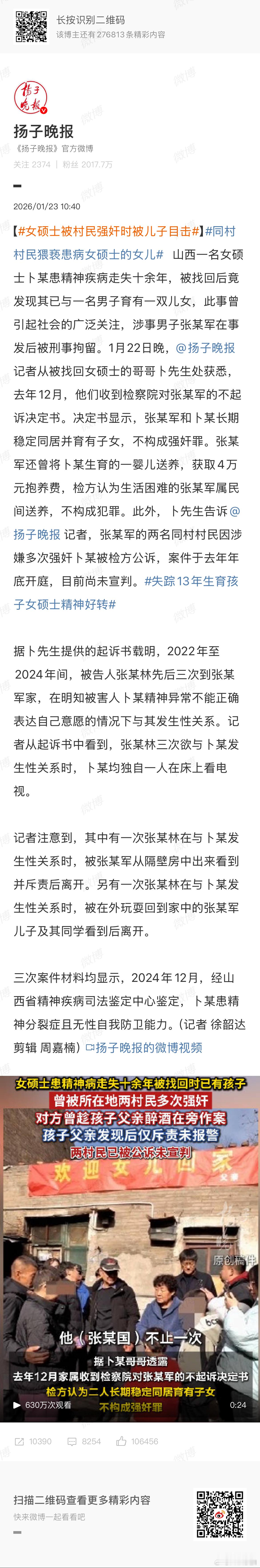 山西女硕士被强暴生育这事儿,震惊我的恐怖点太多了,以至于我很难概括它……1.从罹患精神疾病的女性被“捡”回家生孩子,到案发,跨度达到了13年,2011-2024发生的事儿可太多了,甚至包括口罩和一次人口普查,都没案发,一个精神疾病女人,被带到陌生男人家里,还生了好几个孩子,这么一个大案静如止水,评价一句“当地基层完全失控”可能太轻了吧……2.这位女患者在当地被多人强暴,女儿被猥亵,在2024案发之前也是静如止水,我是不是可以合理推断,这些禽兽行径在当时这村里,是被默许的,它们日常生活就是这样的?3.“长期稳定同居,不构成强奸”,说明在当地一些领域内,法律这个道德底线也是失灵的,甚至是为虎作伥的。4.这四万块钱卖孩子不算犯罪,我已经难以用言语评论了。反正整个新闻看下来,我觉得这个罹患精神疾病的女子基本等于到了一个基本只有人型禽兽的无人区,周围一切都是奔着把她吃干净来的。如果不是案发,她女儿将来很可能也是另一个她。是拍成恐怖电影都难过审的程度。而这份不起诉决定书,说明这份恐怖应该土壤十分肥沃,只要“女猎物”合适,恐怕还能有许多续集,长长久久,寿与天齐。