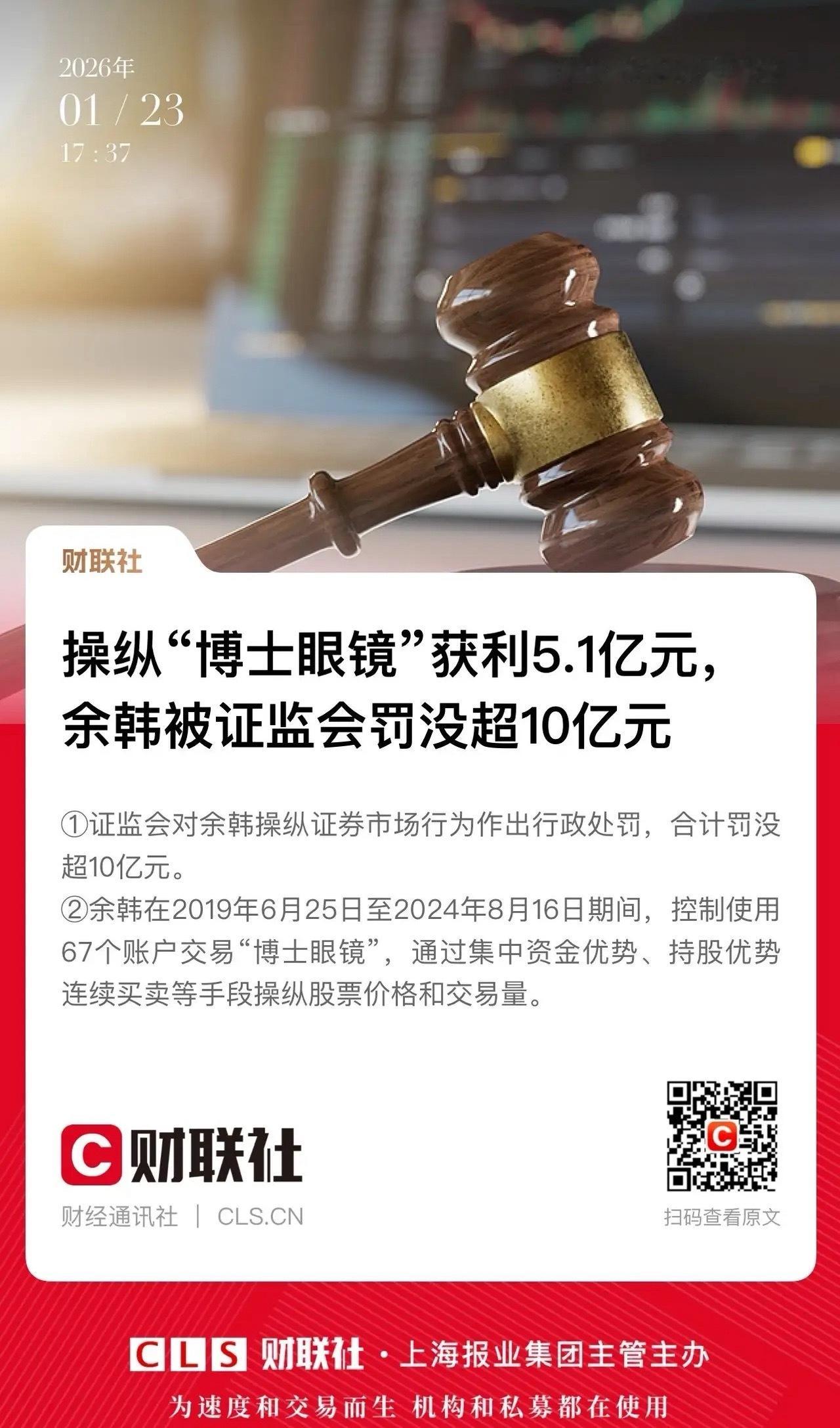 操纵“博士眼镜”获利5.1亿罚没超10亿!这是真的不孝子孙,祖宗都要气到掀棺材盖!余韩耗时5年动用67个账户,可谓是呕心沥血了,为谁辛苦为谁忙,待到头来梦一场!资本市场离钱太近了,充满了各种各样的诱惑,马克思在资本论中直击资本的贪婪本质:【资本害怕没有利润或利润太少,就像自然界害怕真空一样。一旦有适当的利润,资本就胆大起来。如果有10%的利润,它就保证到处被使用;有20%的利润,它就活跃起来;有50%的利润,它就铤而走险;为了100%的利润,它就敢践踏一切人间法律;有300%的利润,它就敢犯任何罪行,甚至冒绞首的危险。】A股现在的监管不比往昔,敢乱伸手必然遭到重拳打击!…