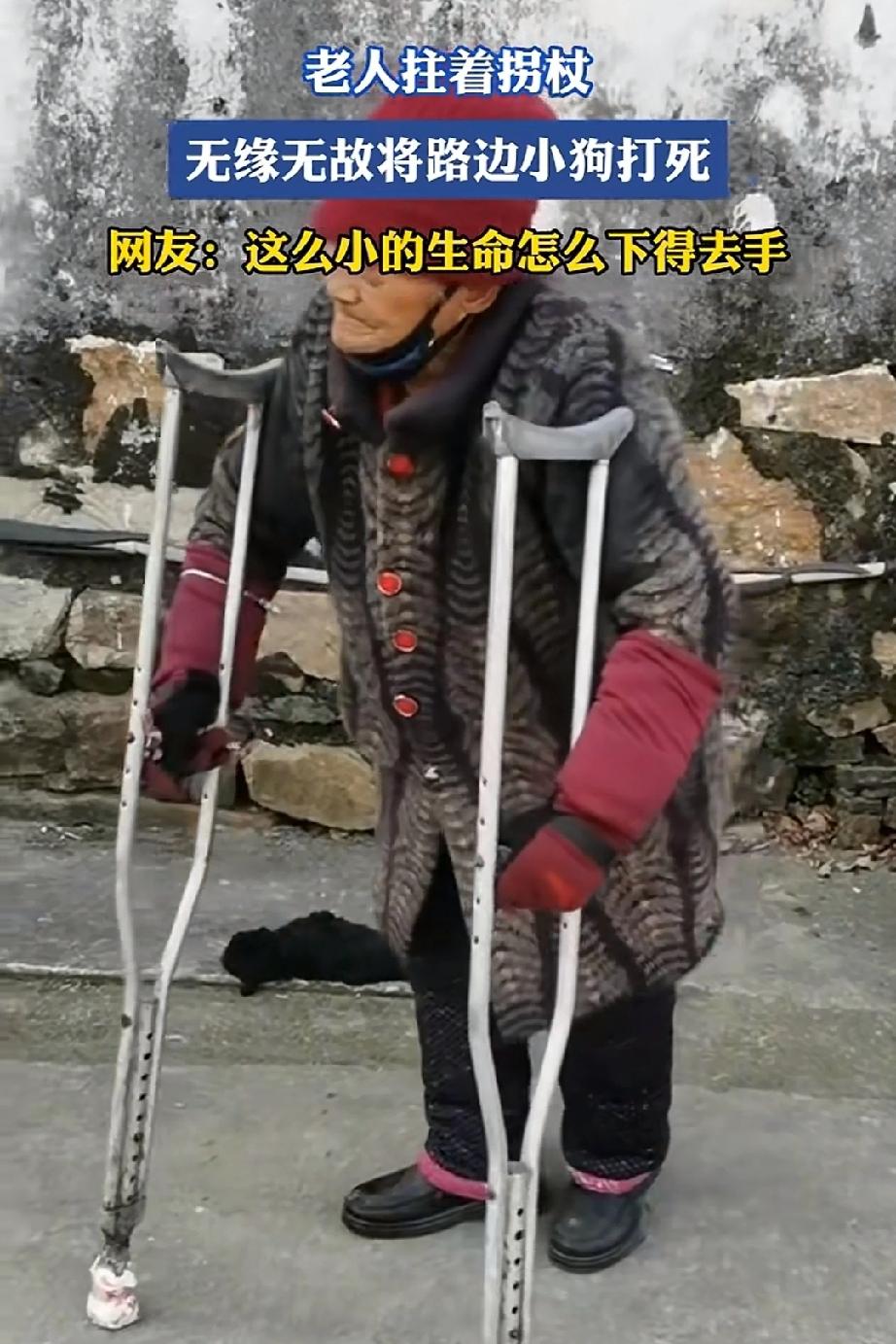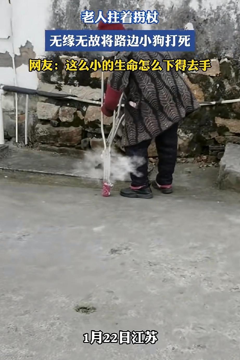 太残忍了! 好歹也是一条小生命,才多大点小狗啊!就被活活打死,怎么下的去手。 江苏一老人拄着双拐,走到路旁无缘无故的将一只小黑狗用拐杖打死,然后若无其事的走了,好好的一只小狗瞬间丧失了生命,让人看到心疼死了! 呼吁大家爱护生命吧!狗是人类忠实的朋友,千万别去伤害它,万物皆有灵!做一次善事等于免去一场灾难!