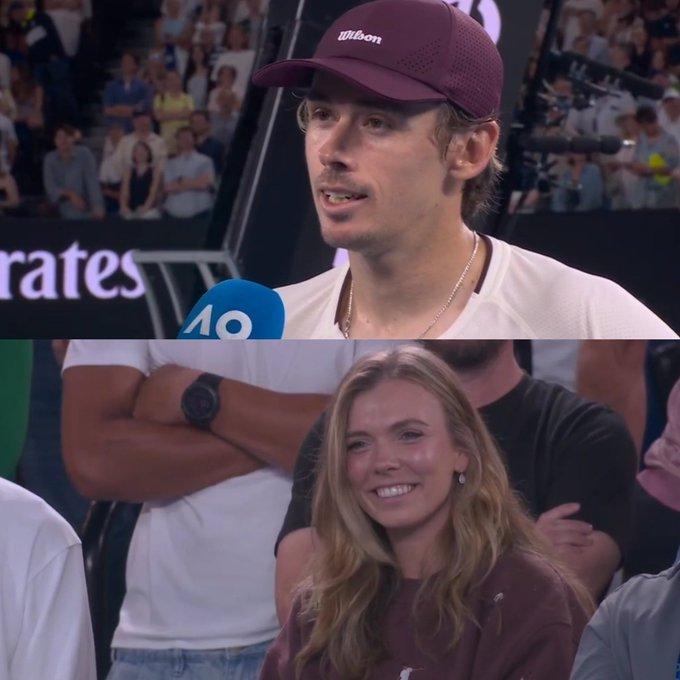 德·米纳尔连续第五次闯入澳网 16 强,赛后 考瑞尔 :“我们都知道您有多渴望大获成功,不过今年您已经锁定了一场巨大的胜利。您和您的未婚妻今年就要结婚了。恭喜您和凯蒂。您打算在婚礼筹备中参与多少,还是打算全交给凯蒂?” 亚历克斯:“你在怀疑我吗,吉米?” 😂 考瑞尔:“我绝对怀疑你” 😭 亚历克斯:“这就像是一段五五开的关系,对吧?” 吉米:“你没结过婚。你不懂。你马上就要成为一家非常棒的公司 49% 的股东了。” 😂 亚历克斯:“说实话,我们俩都是网球运动员,日程都排得很满,但我们已经尽可能多地一起参与了。到目前为止,一些决定我都参与了。当然,像餐巾纸、鲜花和装饰之类的细节,那不是我的专长,这些就交给凯蒂吧。”