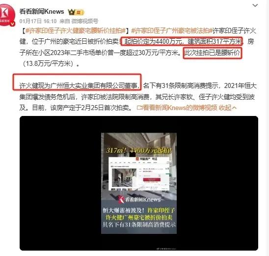 许家印侄子豪宅4400万拍卖,撕开了欠债万亿恒大的冰山一角。近日,又一则关于恒大的消息值得关注,许家印侄子许火健在广州的一处豪宅被挂牌拍卖,起拍价高达4400万。公开信息显示,这处豪宅位于广州核心区位,面积317平米,该小区二手房23年最高时一平30万,如今已腰斩,却仍然是妥妥的豪宅。 在恒大和许家印案件中,许火健的存在感很低,多数人可能也是头一次听到这个名字。这次豪宅被强制拍卖,直接原因是由于一起190.4万的合同纠纷没解决,债主起诉后就查封拍卖了许火健的广州豪宅。不到200万的债没还,结果价值4000多万的豪宅被拿去拍卖抵债,这笔账怎么看都太亏。事情当然没这么简单,在许家印手下做事,不会干这种赔本买卖。 实际上许火健豪宅被拍卖,直接原因并不是因为牵扯到许家印,而是许火健名下的广州雅旭装饰公司深陷财务危机,拖欠分包商超1亿,此外还有未支付的供应商工程款超10亿。许火健自己已经背了30多条限消令和数百起官司,也就是说,这不是一起单独的案例,背后一堆债主都堵在许火健门口等着要债。 许火健虽然为人低调,可也不是什么泛泛之辈,他是广州恒大集团董事,而法人正是许家印前妻丁玉梅。光是这层关系,就能看出来许火健早就是恒大核心人物。而且许火健的装饰公司,他自己持股只有20%,另外80%股份在许家印哥哥许家钦名下,这家装饰公司长期以来最大客户就是恒大,恒大倒了自然被直接波及。 这次许家印侄子被拍卖豪宅,再次给无数恒大债主提了个醒,恒大几百亿被转移的资产,大概率不是许家印和丁玉梅就能搞得定的。正如恒大帝国不是一天建立的,那些盘根错节围绕在许家印家族周边的人,没有一个善茬,他们都该为恒大帝国的倒塌负责。更不用说,这么多年跟在许老板身边耳濡目染,哪个手上都不可能干净。