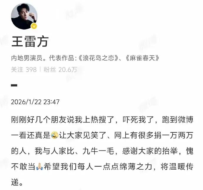 演员王雷方十八线小明星,向嫣然天使基金,月捐500元,这可比很多明星大气多了。 演员王雷方晒出捐款截图,太感人了,每月五百,承受能力范围之内。 王雷方发文回应称:让大家见笑了、网上有很多捐一万两万的人,我与人家比、九牛一毛,感谢大家的抬举,愧不敢当。希望我们每人一点点绵薄之力,将温暖传递。 还调侃自己是十八线小演员钱不多、请别喷。等我富裕了,再多捐点。 真是有大爱,这样一年下来也要6000块,对于患儿来说,恩重如山,满满的爱心。 捐赠证书图片显示王雷方给嫣然天使基金捐款500元,支付截图显示已开通自动续费服务。 李亚鹏16年的坚持让很多人动容,如今嫣然医院度过难关,李嫣的不完美,成为了她与父亲母亲的骄傲。 这一次,李亚鹏感动的主要是广大网友,众人拾柴火焰高,几十几百的捐助。 当当网创始人李国庆率先行动捐赠100万 ,陈光标也与李亚鹏会面,还调侃让王菲女士出来开演唱会,决定一起携手同行。 但支持嫣然基金会的明星并不多,像王雷方这样的不多。 以前李亚鹏与王菲在一起的时候,他在娱乐圈混得也是风生水起,刘嘉玲夫妇、那英夫妇,都是他们家的座上宾。 王雷方长得还挺帅气的,长得有点像彭于晏,虽然以前不知道他,以后会多关注他的作品。 愿大家都被爱与被爱包围。