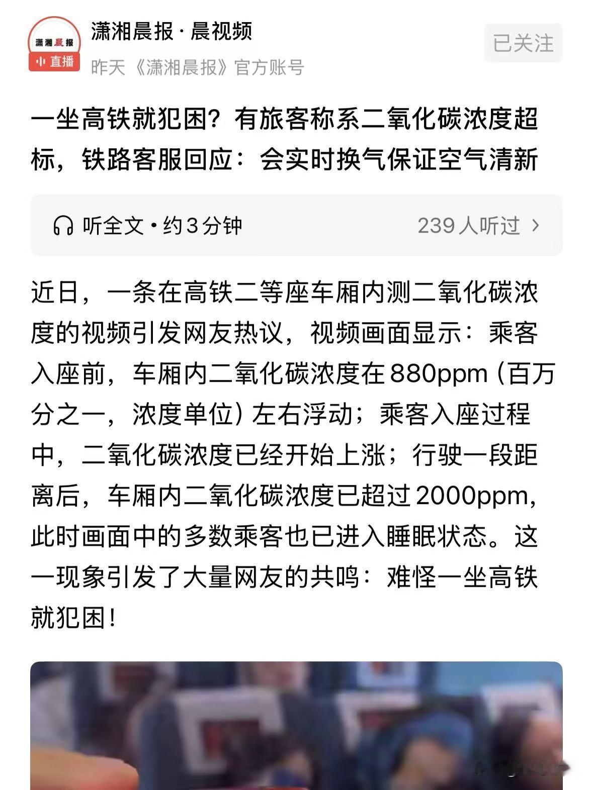 一坐车就困对吗?男子经常做高铁出差,每次上车前还要提前买一杯提神咖啡,因为自己一上车就犯困,一下车就好,而自己的工作性质又经常要在车上办公,他怀疑是车厢内的空气有问题,后来他在次乘坐高铁的时候,他带了个专业的设备,对车厢内的空气进行检测,这不检测不知道,一检测吓一跳,设备上显示车厢内的二氧化碳浓度严重超标,浓度达到2207ppm,很容易对人身体产生伤害,比如让人痛昏脑涨,昏昏欲睡,就好比是给大家集体催眠,搞清楚原因后,男子立即给12306打电话,万万没想到,客服的回复把人气笑了! 余先生是做空气检测行业的,干这行的都知道,出差跟吃饭一样平常,尤其是高铁,几乎成了他的移动办公室。 按理说,干空气检测的,对环境敏感度比普通人高,可他偏偏被高铁拿捏了。 他每次出差坐高铁,不管是早上还是下午的车。 只要一上车,找好座位坐下,打开电脑准备办公,没一会就开始犯困,眼皮子打架,脑子发沉。 他纳闷自己明明咖啡已经提前买好,上车前猛灌了大半杯,照样挡不住睡意,有时候迷迷糊糊就睡过去了。 等醒来要么快到站了,要办公的活一点没动,急得他直跺脚。 更气人的是,这犯困还挑地方,只要车一到站。 他走下车厢,吸一口外面的空气,那股子昏沉劲立马就散了,脑子也清醒了,跟换了个人一样。 一次两次也就罢了,次数多了,余先生心里犯了嘀咕。 难道是我年纪大了?不对啊,我平时在办公室待一天都不困,怎么一上高铁就不行? 作为空气检测从业者,他第一下就开始怀疑会不会是车厢里的空气质量有问题。 这个念头一旦冒出来,就跟生了根一样。 转天公司又安排他出差,这次他特意把专业的二氧化碳检测仪装进了包里。 上了车,找到自己的座位坐下,余先生先没急着打开电脑,而是拿出检测仪。 一开始人少仪器上的数值还挺正常,可随着车厢里的人渐渐坐满,火车缓缓开动,数值就开始一点点往上窜。 余先生盯着仪器,心里也跟着紧张起来,眼看着数值从800ppm、1200ppm、1800ppm,一路往上冲,最后竟然定格在了2207ppm。 余先生当时就惊呆了,手里的咖啡都差点洒出来。 他干这行多年,对二氧化碳浓度的标准门清,国内现行的《室内空气质量标准》里明确规定。 室内二氧化碳浓度的限值是≤1000ppm,这2207ppm都超标两倍多了,简直离谱。 他又在车厢里不同位置测了几次,过道、车厢连接处、座位中间,数值稍微有点差异。 但都远远超过了标准限值,最低的也有1900多ppm。 这下余先生总算搞明白了自己一坐车就犯困的原因。 二氧化碳对大脑中枢有抑制作用,浓度一高,人就容易昏昏沉沉、注意力不集中。 现在看来,高铁车厢里这超标的二氧化碳,简直就是集体催眠瓦斯。 难怪自己灌了咖啡都没用,难怪好多人一上高铁就犯困,根本不是因为累或者懒,是环境里的二氧化碳在搞鬼。 弄清楚原因后,余先生觉得这事不能就这么算了,毕竟关系到成千上万乘客的健康。 于是下车后第一时间就拨通了12306的客服电话,想反映一下二氧化碳超标的问题,希望能引起重视。 没想到客服沉默了几秒后,给出了个让余先生当场愣住的建议: 先生,要是您觉得车厢里空气不舒服、有点缺氧,您可以自行准备氧气瓶吸氧。 这毕竟每个人体质不同,要是您对空气敏感,提前准备点吸氧设备会舒服些。 余先生当时就气笑了,做个高铁还要自备氧气瓶,真拿我们当登山队员了! 挂了电话的余先生不甘心,又打了第二个电话。 他表示有明文规定《室内空气质量标准》,CO₂限值是≤1000ppm,公共场所按最高1500ppm来算,现在都2207了,属于超标严重。 没想到第二个客服的回复更绝:先生,您说的这个标准我们目前还不清楚。 但车厢虽然是密闭空间,我们的中央空调却一直在恒温换气,肯定是有氧气的,不会让乘客缺氧。 后来客服又说可能是因为余先生那趟车的乘客密度比较高。 人多的话,大家呼吸吐出来的二氧化碳自然就多了,浓度难免会高一点。 这话听着像那么回事儿,人多废气多嘛。 可人多也不不是超标的理由,室内空气质量是有标准的,不管你车厢挤不挤,不管人多人少,都得达标。 要是一坐满就必超标,要么是通风设计本身就不行,要么就是新风系统没好好开,没起作用, 反正不能把锅甩给乘客人多,大家都买了票,还得硬扛着超标的空气,头疼犯困遭这罪? 这事一出来不少人表示,怪不得一座高铁就犯困。 二氧化碳超标先让人迷糊,在加上车运行时的那种嗡嗡声,还有点像婴儿摇篮和催眠曲。 再加上车厢里温度恒定、光线又不刺眼,窗外景色千篇一律,这些因素凑一块,确实是睡觉的好环境。 这要是下次再座高铁昏睡过去,千万别自责,那是正在强制关机。 对此,你怎么看这件事? @静心法谈 学法辨是非,慬法不吃亏。