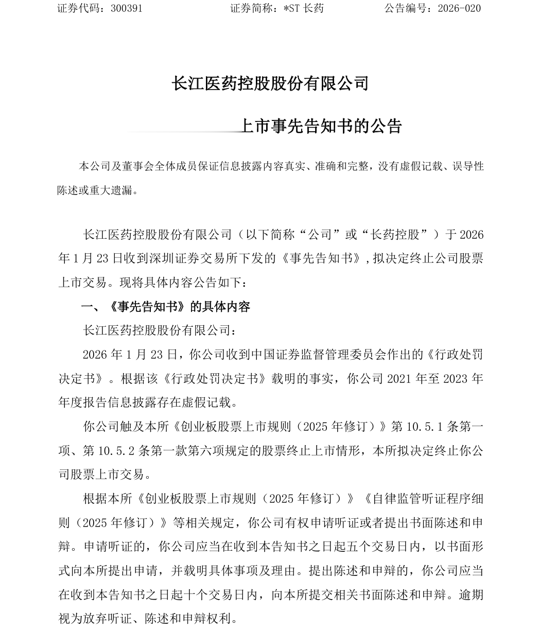 1月23日晚间,*ST长药发布公告称,公司当日收到证监会下发的《行政处罚决定书》。经证监会查明,*ST长药2021年至2023年年度报告存在虚假记载。证监会决定对*ST长药责令改正,给予警告,并处以1000万元罚款。同时,因*ST长药触及重大违法强制退市情形,公司股票将于2026年1月26日起停牌,深圳证券交易所将依规启动退市程序。