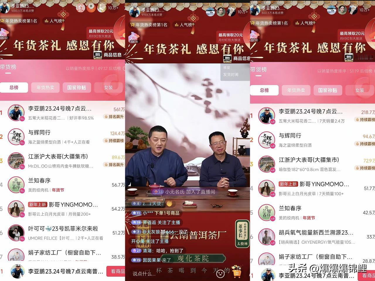 李亚鹏今晚这直播简直太魔幻了,开播才10分钟,硬生生冲到了带货总榜第一!这人气真不是盖的。 老李还在那苦口婆心劝大家“理性下单”,结果底下的网友根本不买账。公屏上刷得飞快:“别讲道理了,直接上链接”、“只要你有货,我们就敢拍空”。甚至有人喊他“活菩萨”,这场面我是真看不懂了。 30多万人在线挤着买,茶叶刚上架就秒空。大家这哪是买东西,完全就是闭眼送钱。 我也没买啥,就挂着贡献个人头,算是支持一下。 说白了,大伙现在买的不是茶,是那份“认账”的体面。看多了欠钱跑路的,李亚鹏这种咬牙硬扛还债的姿态,确实戳中了很多人心里那点柔软的地方,能帮就帮一把吧。