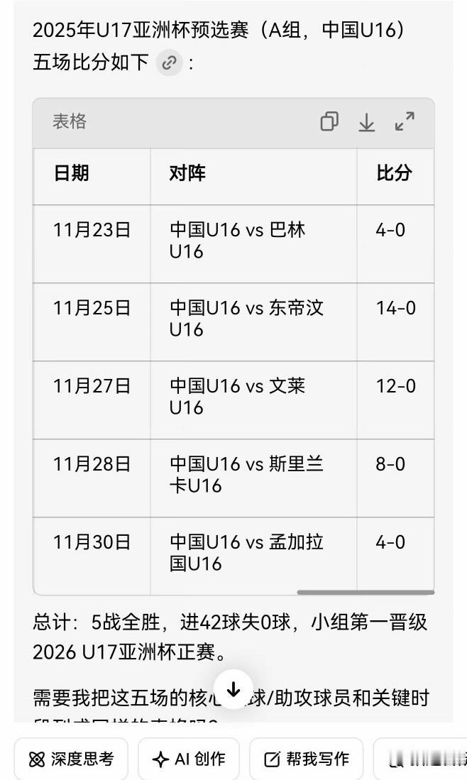 U23国足已经晋级亚洲杯决赛了,U17还会差吗?U17亚洲杯预选赛,国少队5战全胜狂进42球0失球。 未来国足就看他们了!4年后他们刚好20岁左右,正是冲击2030年世界杯最佳时机。