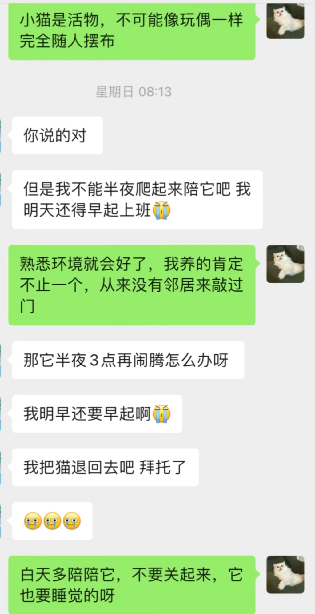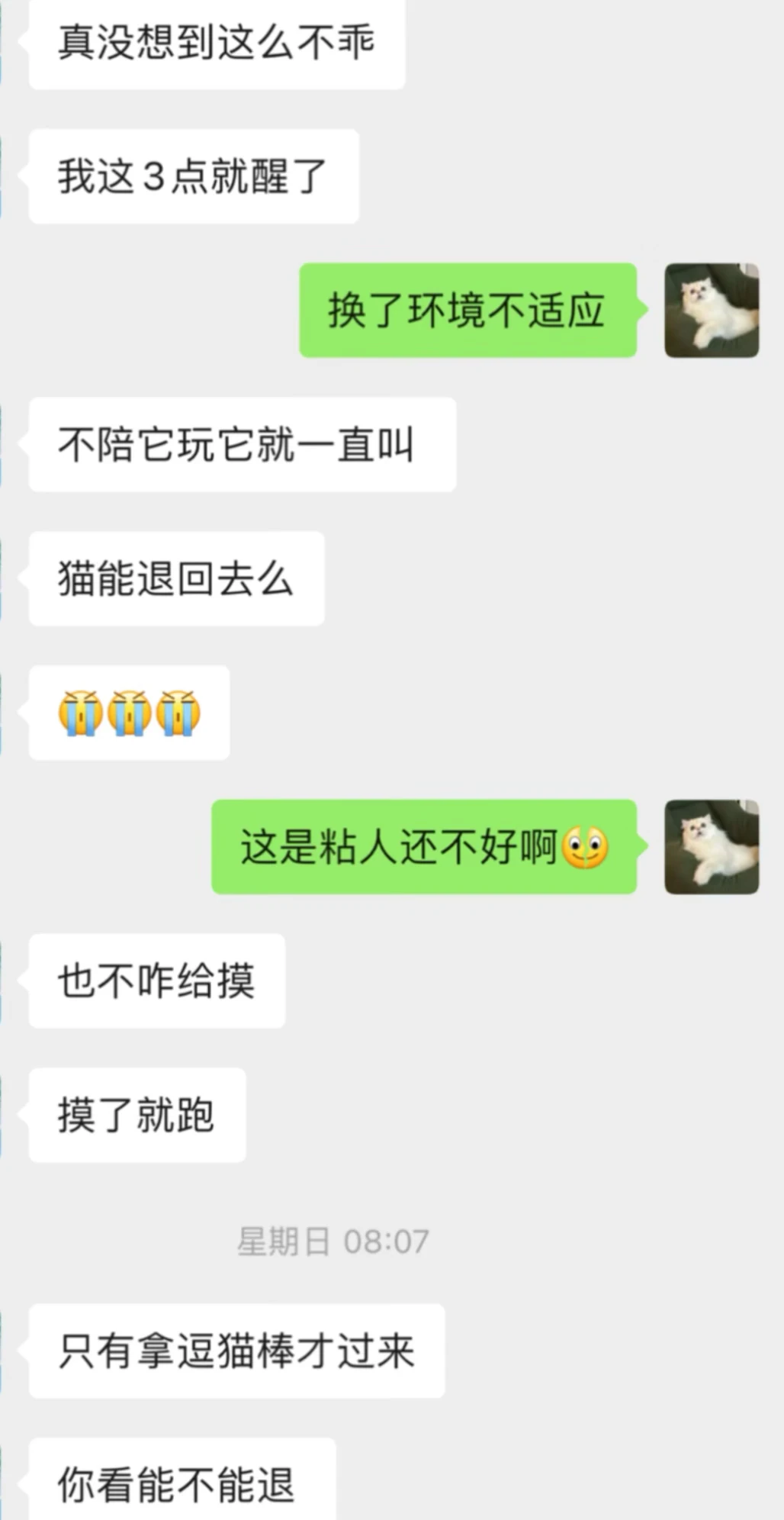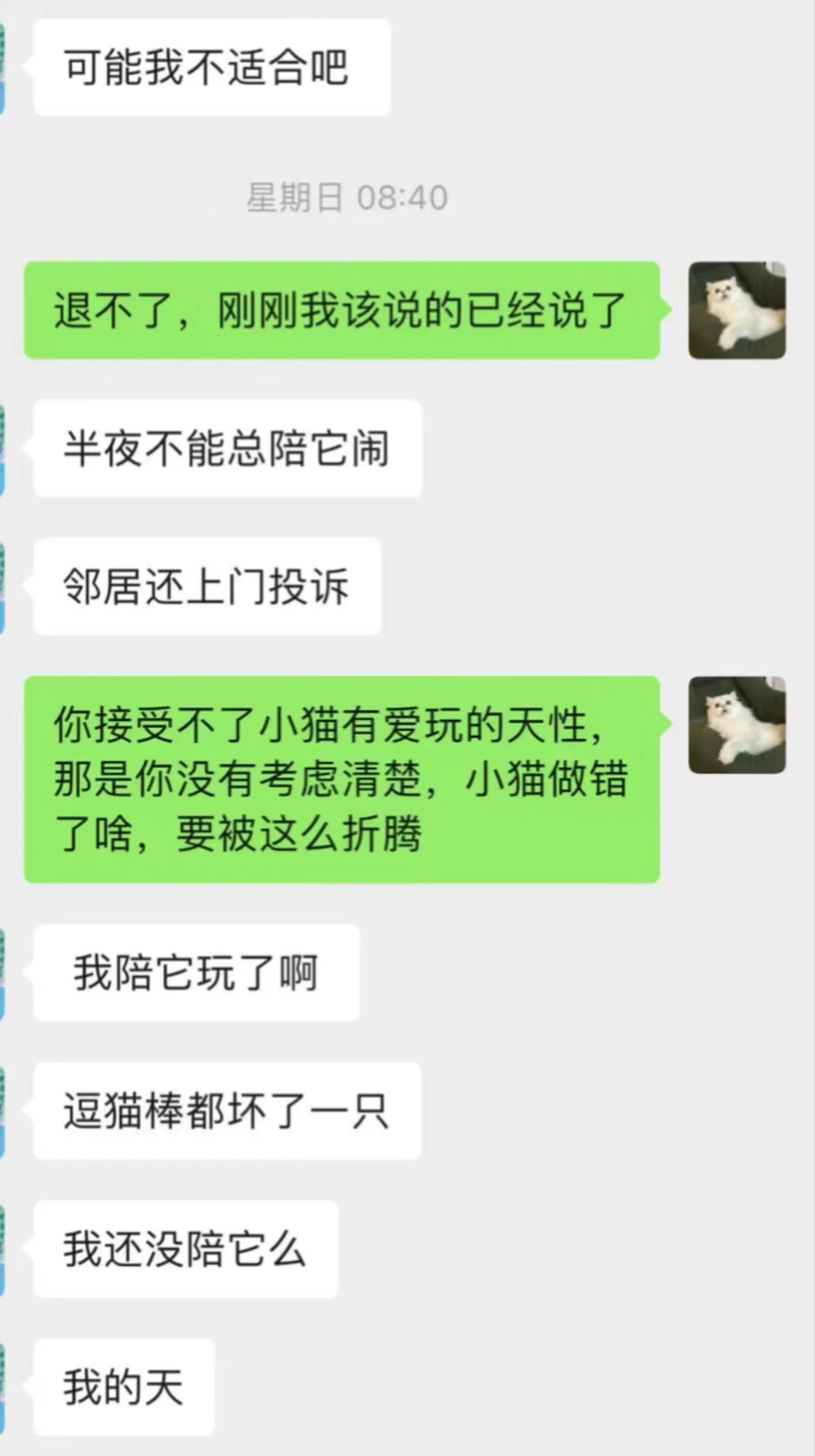 这个猫猫是一个星期前预定的,现在接回来不到24小时,我不想养了可以退吗? 提前给猫猫准备了个小小笼子,但是关不住它,因为在原繁育人那里是散养的,而且看不见人就一直叫,吃的猫粮和水就在猫砂盆旁边,上完厕所都不用转身就能吃到,都这样好好给它准备了还不领情,还把逗猫棒都咬坏了一个,实在太不乖了,在繁育人那里抱手里贴脸都不动,可是我接到不让摸不让抱,一摸就跑,真的不想养了