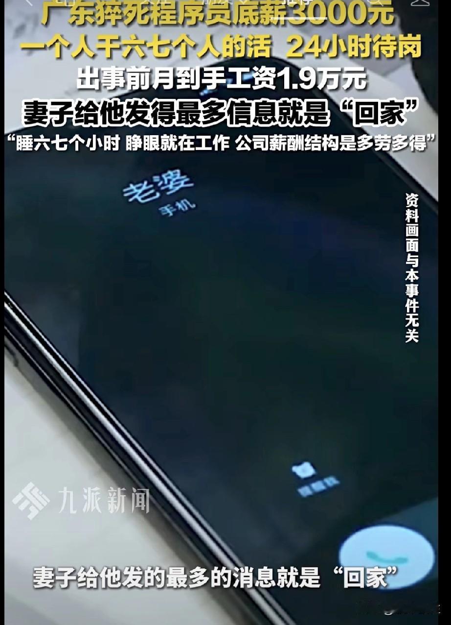 人死了,家散了。 匆匆忙忙,连滚带爬的一生! 打工人皆是牛马。劳动法为什么不执行?资本家的每一个毛孔都是肮脏的吗?希望多一些正能量的老板,少一些黑心的老板,这个社会就和谐了。 1月23日报道,广东猝死程序员底薪3000元,一个人干六七个人的活,24小时待岗,妻子给他发得最多信息就是“回家”。 这样的人间悲剧,真的希望越少越好。请善待每一个打工人,在目前的经济大环境下,日子都不好过。彼此尊重,善待。