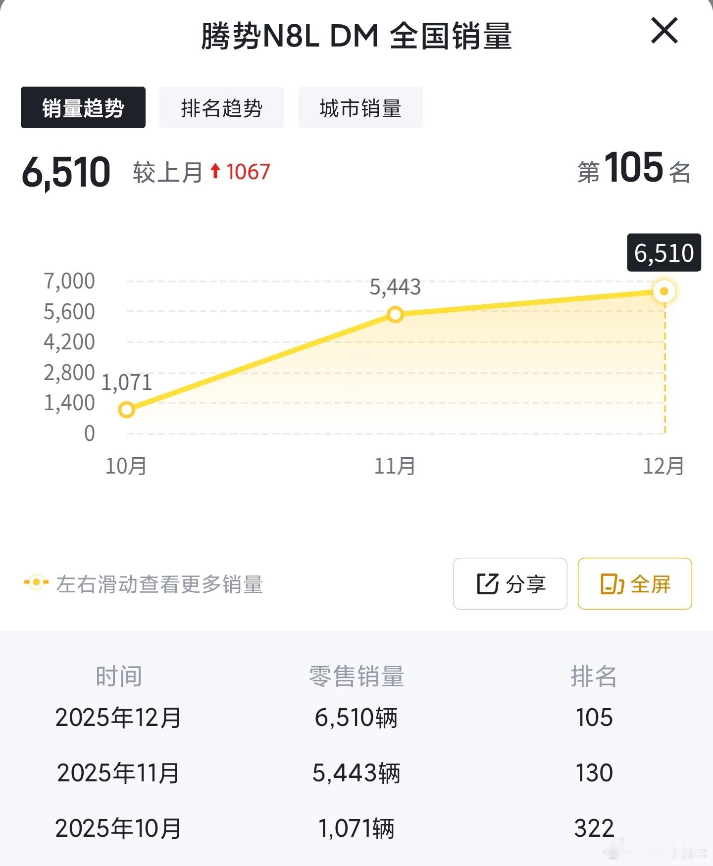 再说下腾势N8L这款车,这样一款30W的车,我认为接下来的后劲会更强。我查了一下,从10月底上市开售交付突破1000台,到12月交付突破6500台,这个成绩其实很不错了。我觉得好的东西早晚会得到更多人的认可,比亚迪不想靠营销,只想靠实力,这也是十几年来比亚迪厚积薄发的关键。当别人用营销抢占市场时,比亚迪只需要坚持技术路线,吸引更多高净值、有内涵、有文化的用户选择腾势,以后腾势的高端之路必定会越来越顺。因为腾势N8L、N9、Z9GT这些产品,都是真的技术很强的产品,有比亚迪自己原创的东西,真懂车的人看的是真材实料,而不应该只是广告词。有点东西比亚迪腾势N8L
