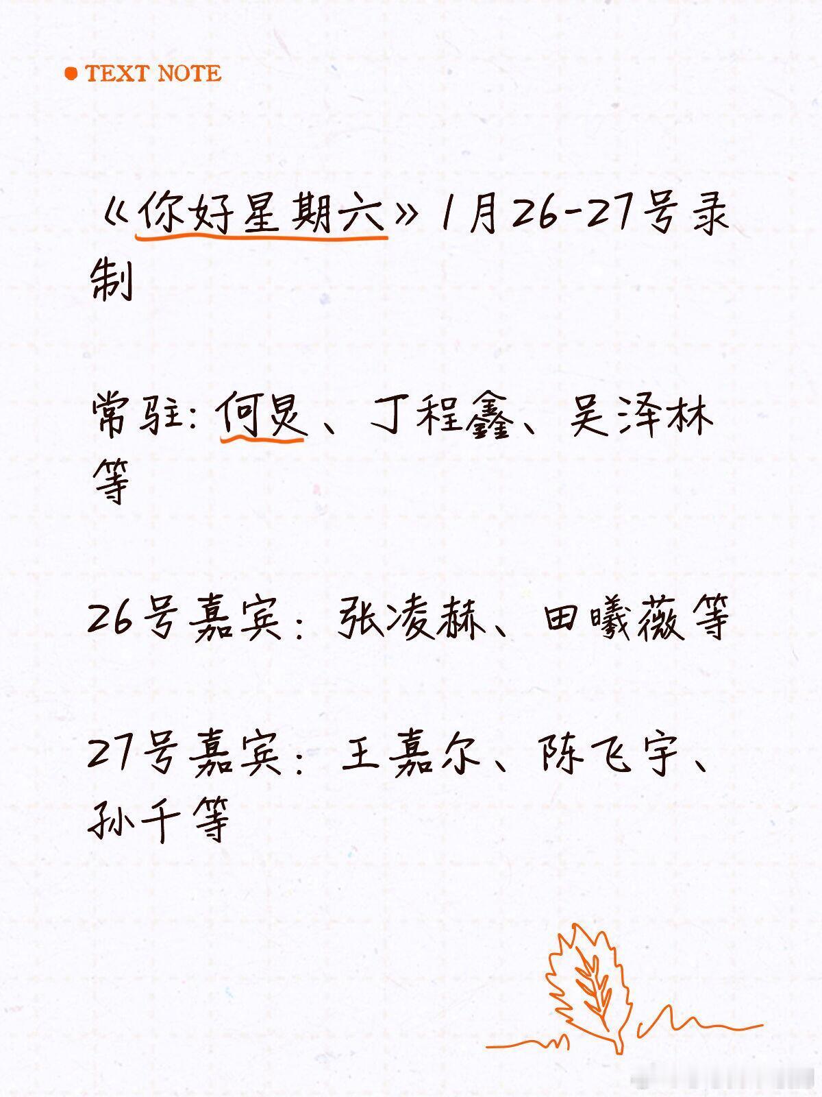 你好星期六《你好星期六》1月26-27号录制常驻: 何炅、丁程鑫、吴泽林等26号嘉宾:张凌赫、田曦薇等27号嘉宾:王嘉尔、陈飞宇、孙千等你好星期六‖