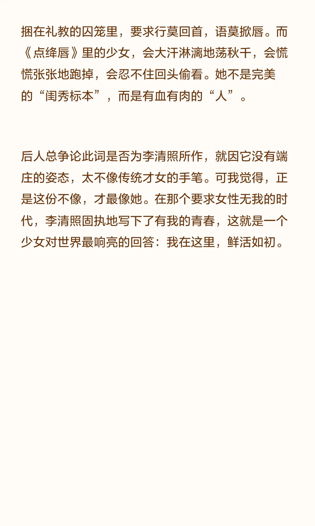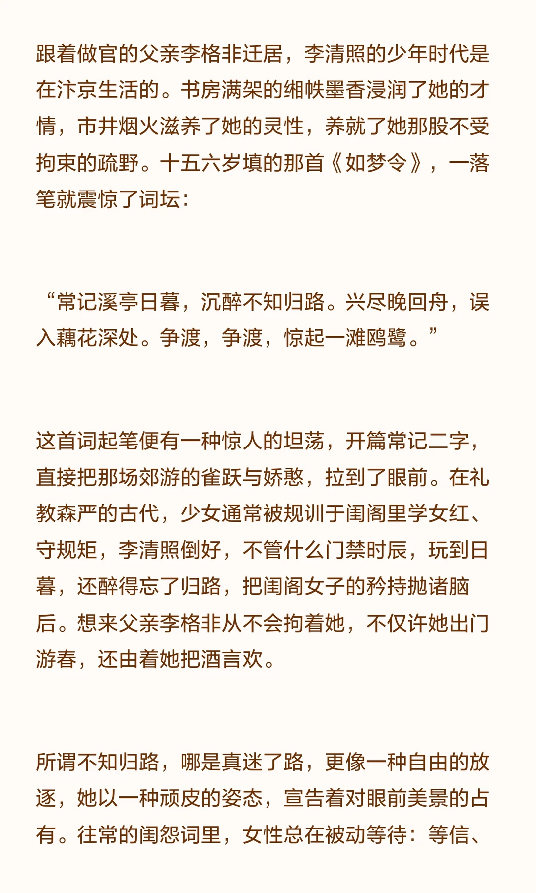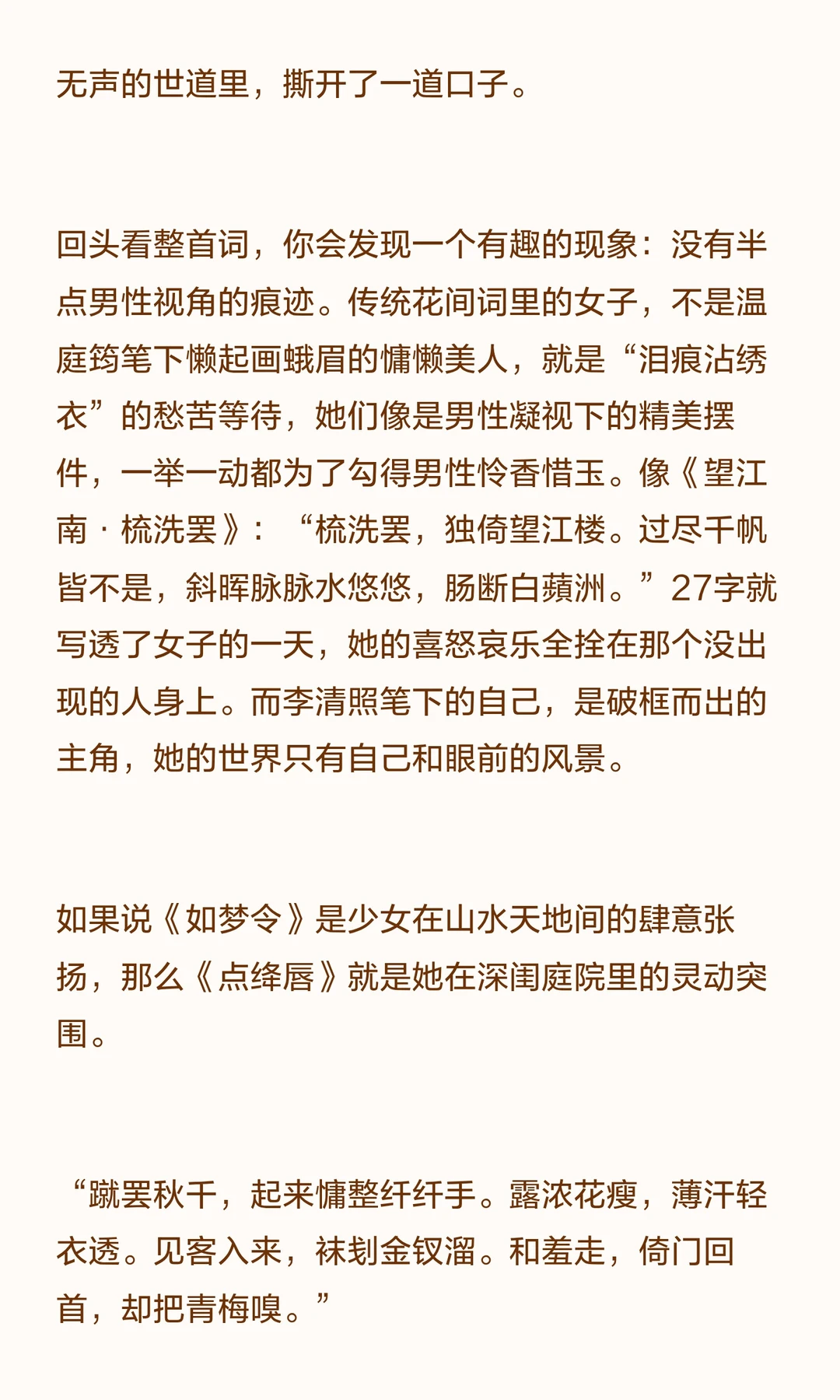 🌸 . 李清照的词作展现了她作为少女的自由与叛逆。从《如梦令》中对自然美景的肆意追逐,到《点绛唇》中对闺阁规范的灵动突围,她以直白的笔触和鲜活的细节,打破了传统女性的被动形象,展现了独立与真实的自我。 .