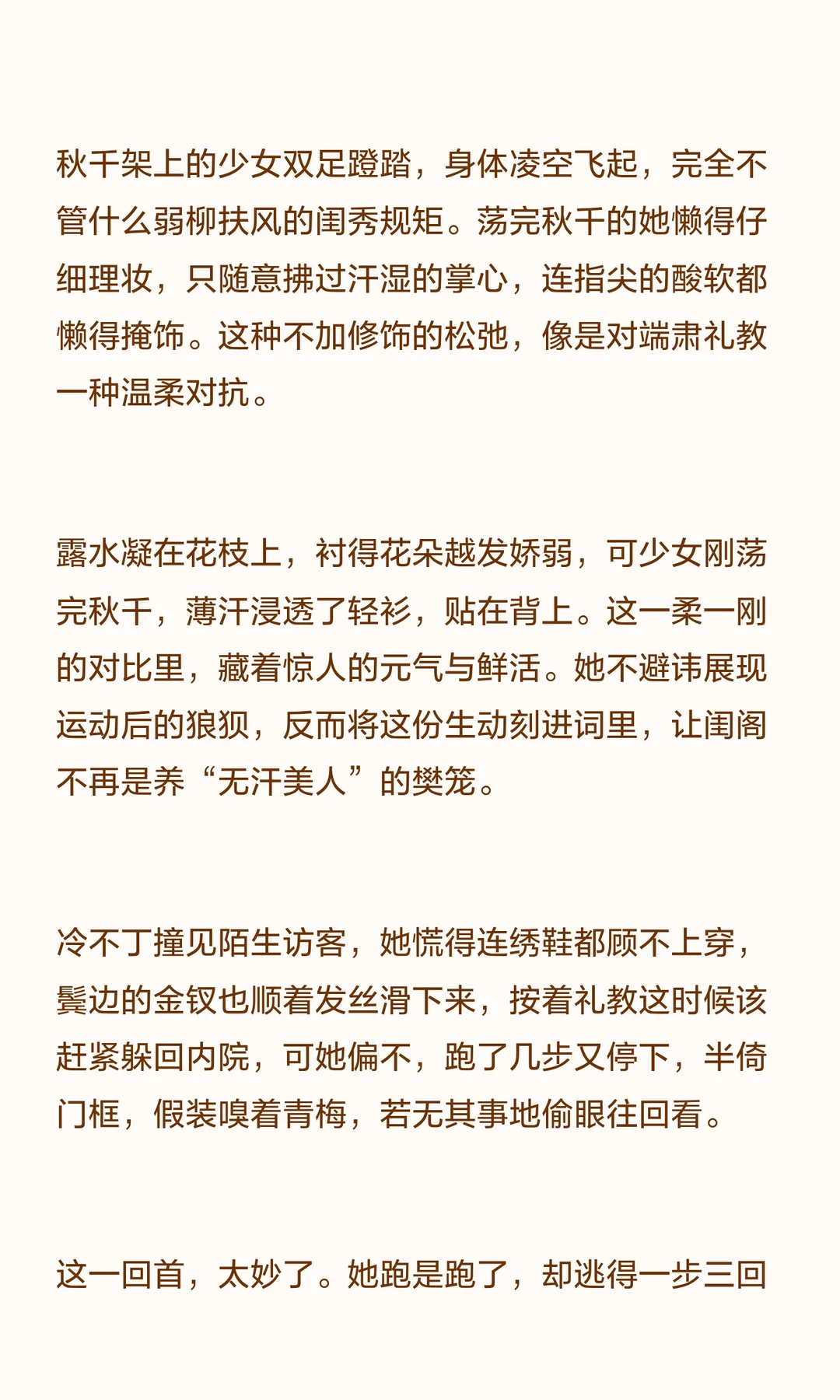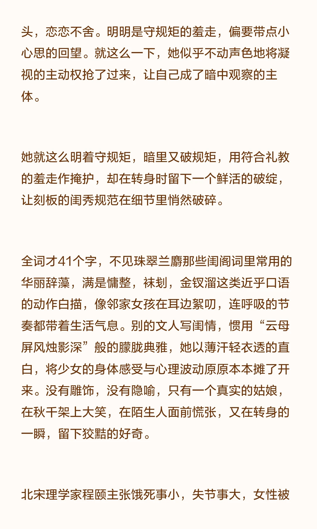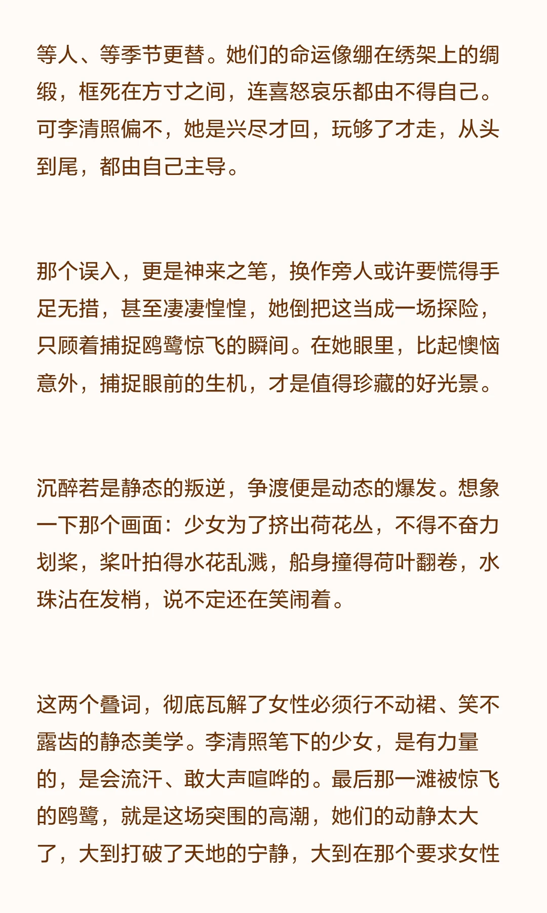 🌸 . 李清照的词作展现了她作为少女的自由与叛逆。从《如梦令》中对自然美景的肆意追逐,到《点绛唇》中对闺阁规范的灵动突围,她以直白的笔触和鲜活的细节,打破了传统女性的被动形象,展现了独立与真实的自我。 .