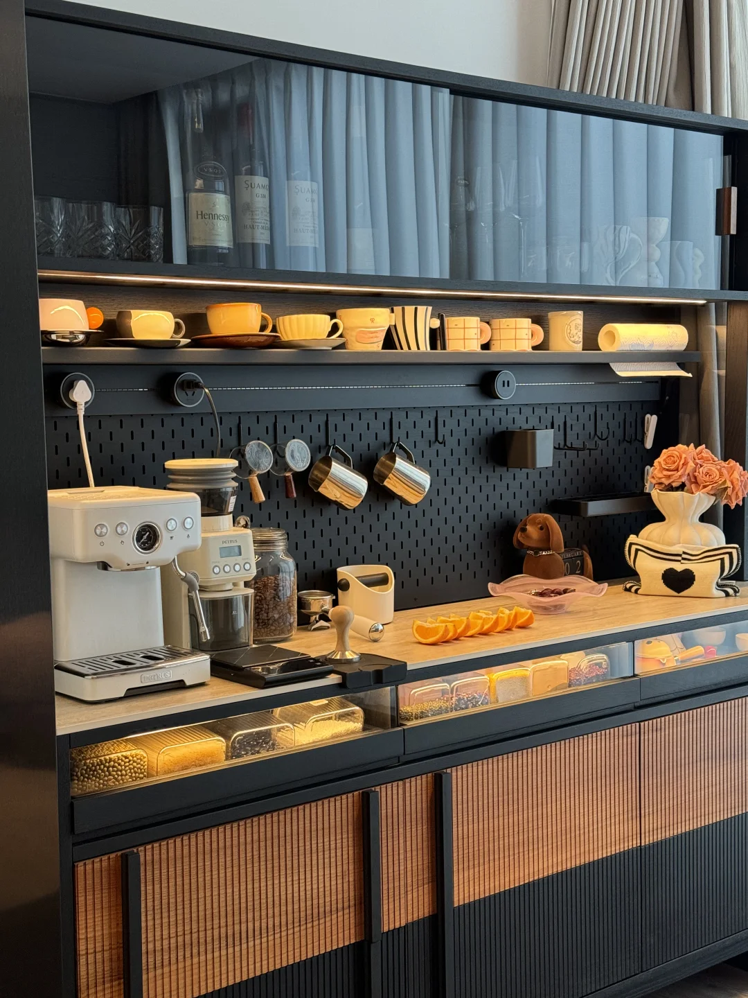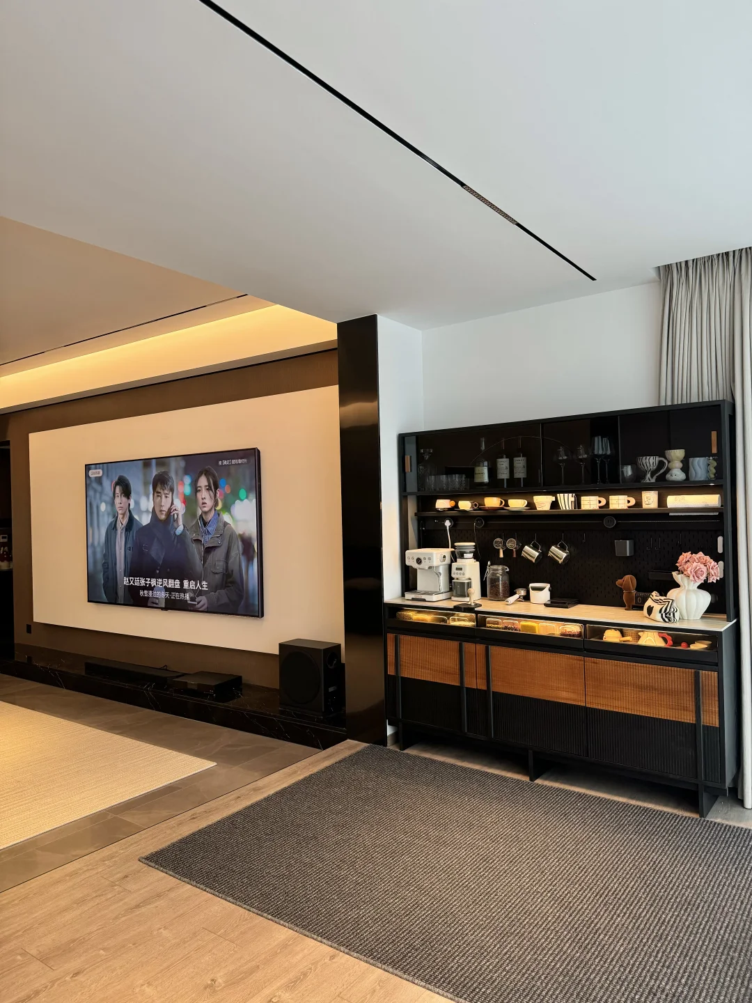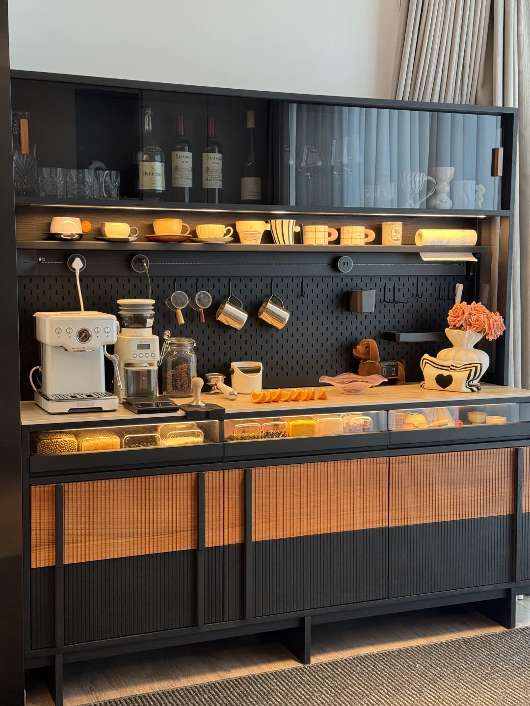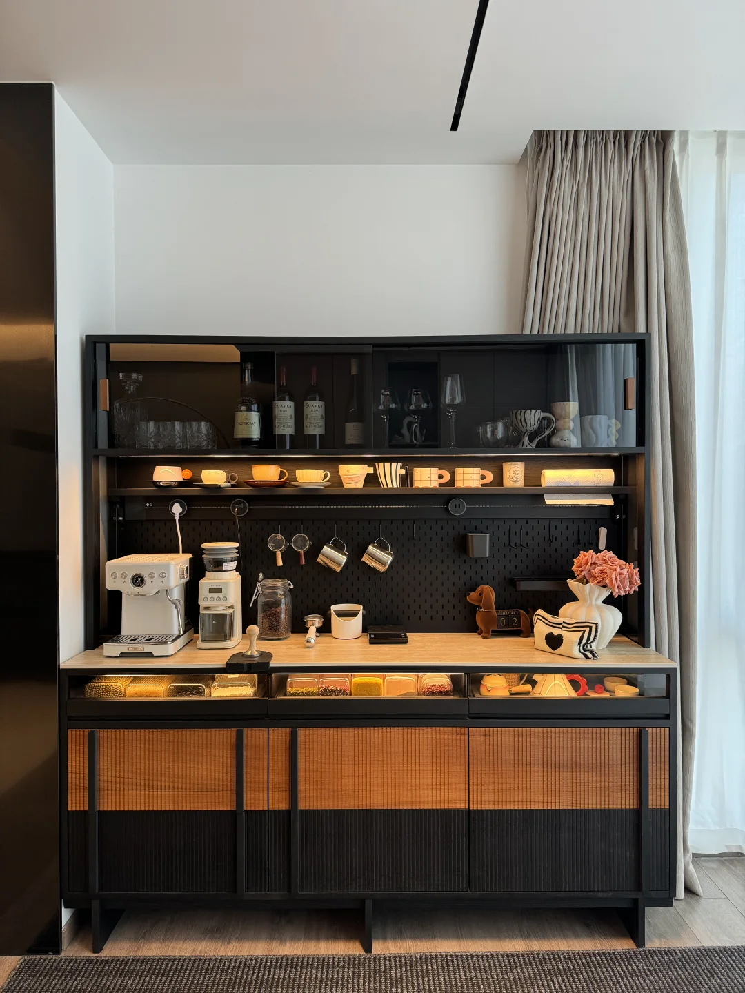 哈喽姐妹们,这里是盐盐的🏠 第一次装修就装出了Dream house ,套内215平的家,我选择把阳台封窗扩大,真的干净又舒服呀~ 我在阳台处安排了一个1.8米的梵也纳序餐边柜,我心心念念的餐边柜终于成功下车!这个颜值真的让人赏心悦目!越看越喜欢🥰 黑色白蜡木和缅甸柚木的撞色搭配复古味十足,高级又沉稳,收纳功能很强大,满足日常的使用,咖啡角、水吧台、收纳等等…… 大容量的储物柜+两个深抽屉,储物力MAX,下层玻璃层板还能调节,对摆放的不同物品不限制,囤货的零食、五谷杂粮、不常用的厨具收纳得整齐有序!一整个舒适 实木洞洞板,摆放很灵活,再搭配上公牛超长轨道插座嵌入柜体,简洁又高级,插座随意调整位置,小家电随用很方便~ 台面洞石岩板防水、耐高温,很耐造、日常打理很省心 上层玻璃柜,可以当展示柜也可以储放酒类🍹 还有隐藏的暖光灯带在置物架上和透明展示抽屉上,触摸开关打开,漫反射晕开,温馨又有格调…… 家里因为有了纳序餐边柜,我也拥有了一个实用又具有氛围感的休闲咖啡角,真的很幸福😊