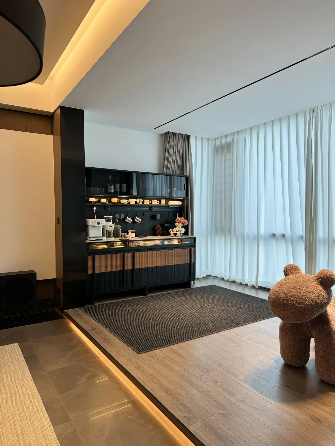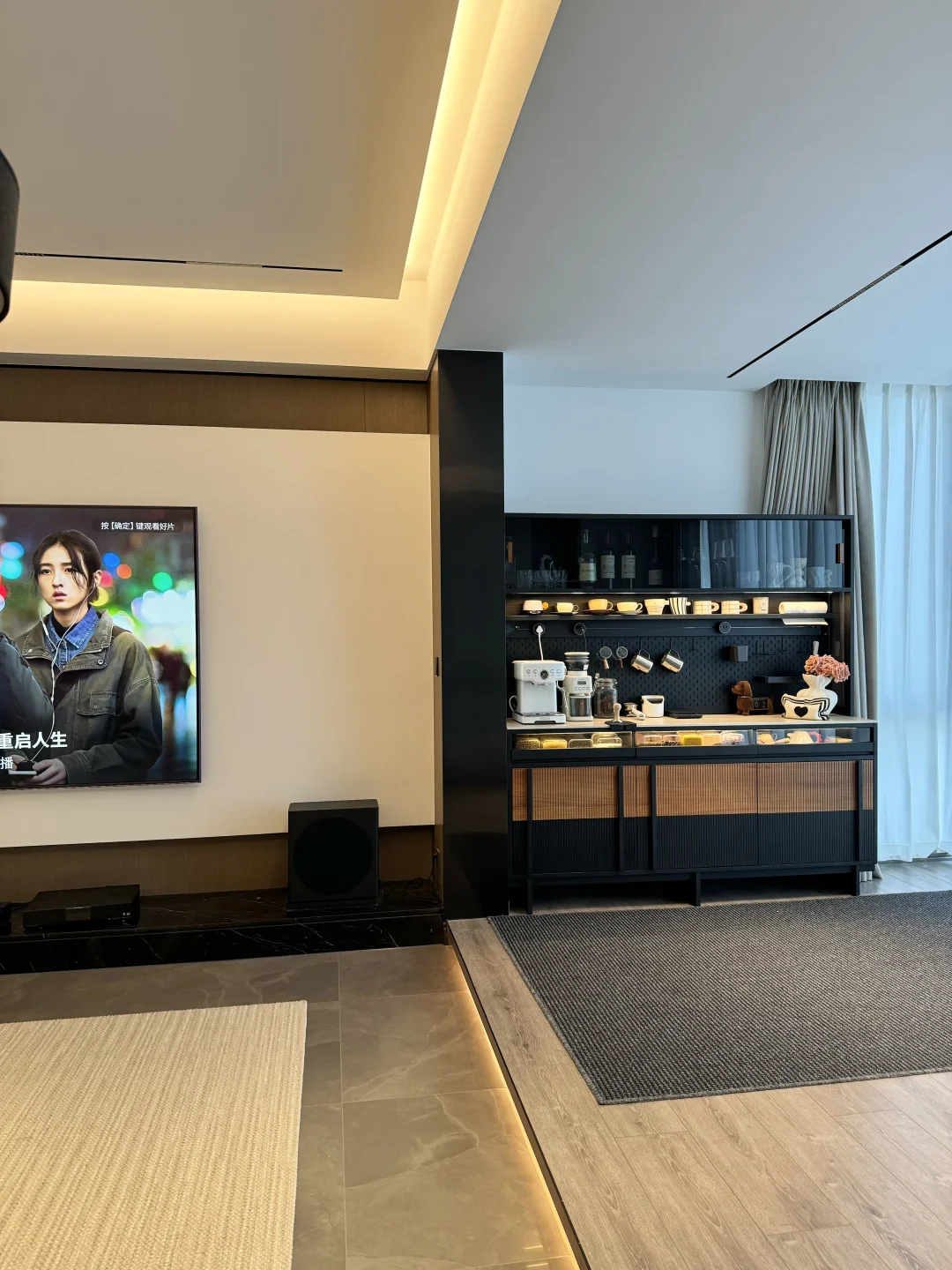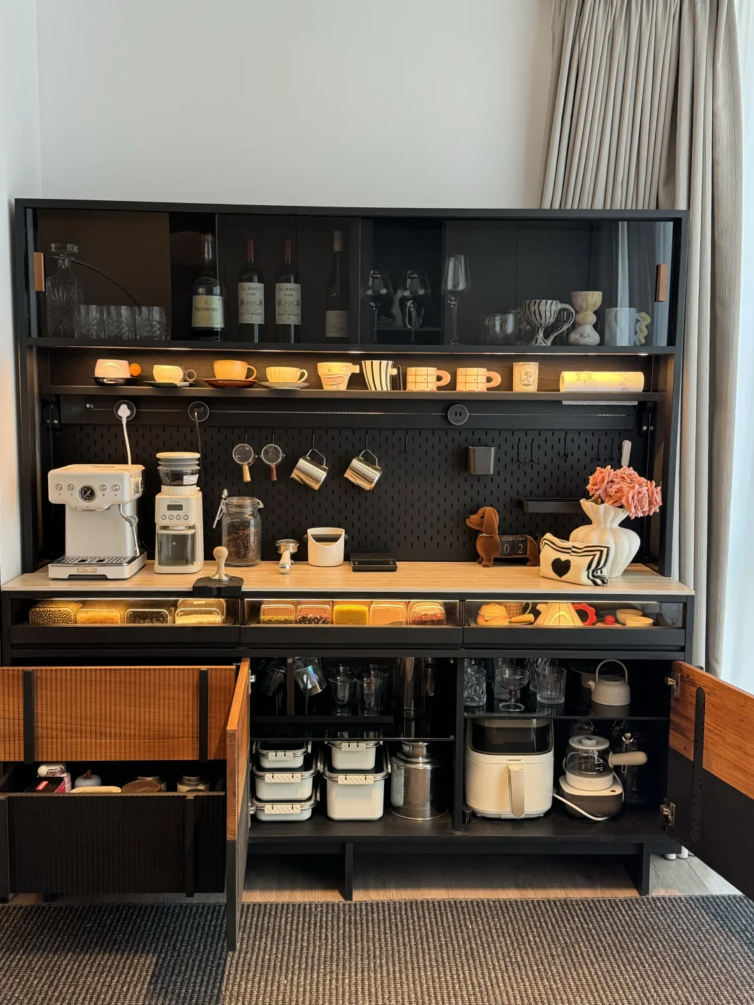 哈喽姐妹们,这里是盐盐的🏠 第一次装修就装出了Dream house ,套内215平的家,我选择把阳台封窗扩大,真的干净又舒服呀~ 我在阳台处安排了一个1.8米的梵也纳序餐边柜,我心心念念的餐边柜终于成功下车!这个颜值真的让人赏心悦目!越看越喜欢🥰 黑色白蜡木和缅甸柚木的撞色搭配复古味十足,高级又沉稳,收纳功能很强大,满足日常的使用,咖啡角、水吧台、收纳等等…… 大容量的储物柜+两个深抽屉,储物力MAX,下层玻璃层板还能调节,对摆放的不同物品不限制,囤货的零食、五谷杂粮、不常用的厨具收纳得整齐有序!一整个舒适 实木洞洞板,摆放很灵活,再搭配上公牛超长轨道插座嵌入柜体,简洁又高级,插座随意调整位置,小家电随用很方便~ 台面洞石岩板防水、耐高温,很耐造、日常打理很省心 上层玻璃柜,可以当展示柜也可以储放酒类🍹 还有隐藏的暖光灯带在置物架上和透明展示抽屉上,触摸开关打开,漫反射晕开,温馨又有格调…… 家里因为有了纳序餐边柜,我也拥有了一个实用又具有氛围感的休闲咖啡角,真的很幸福😊