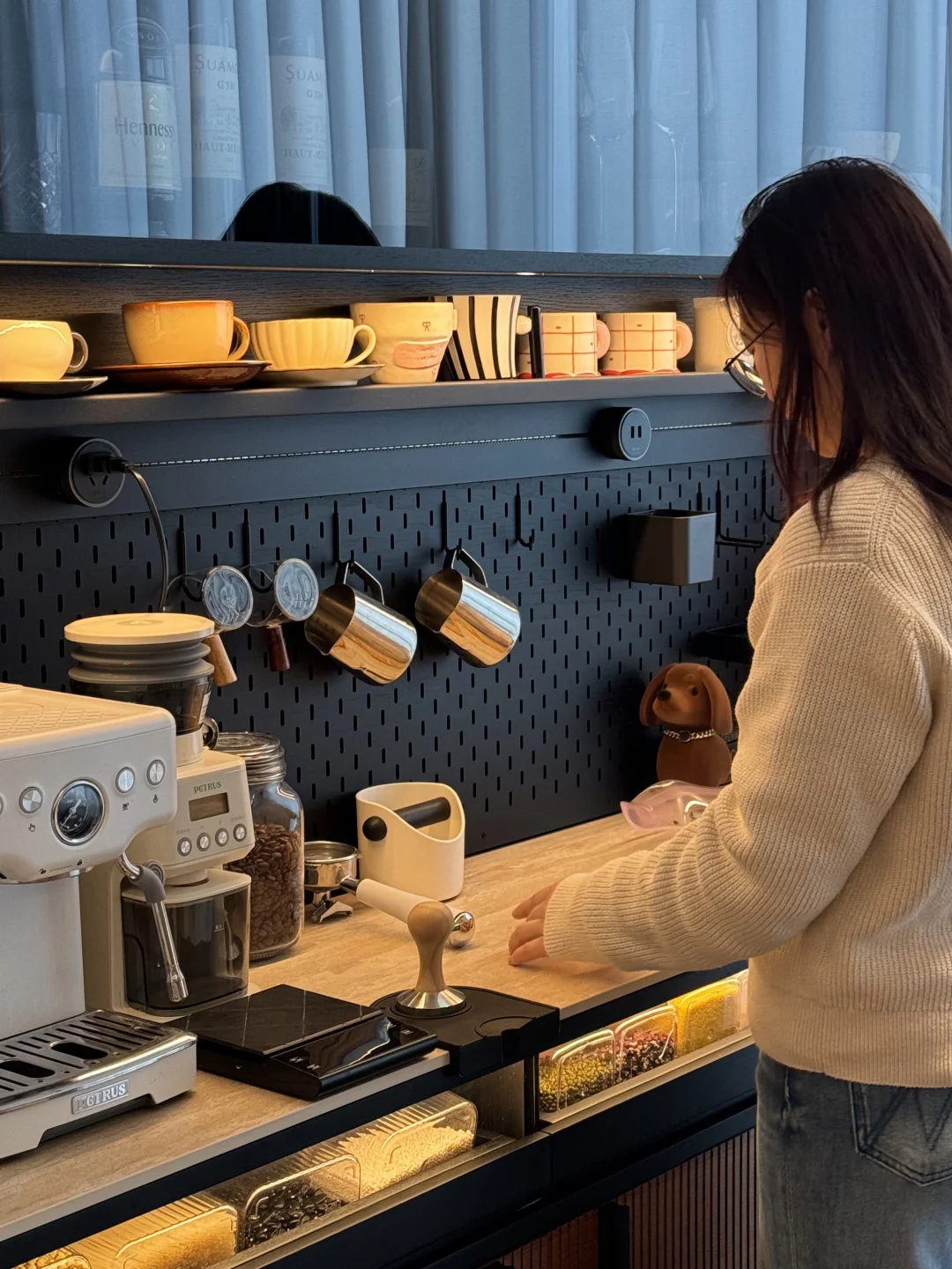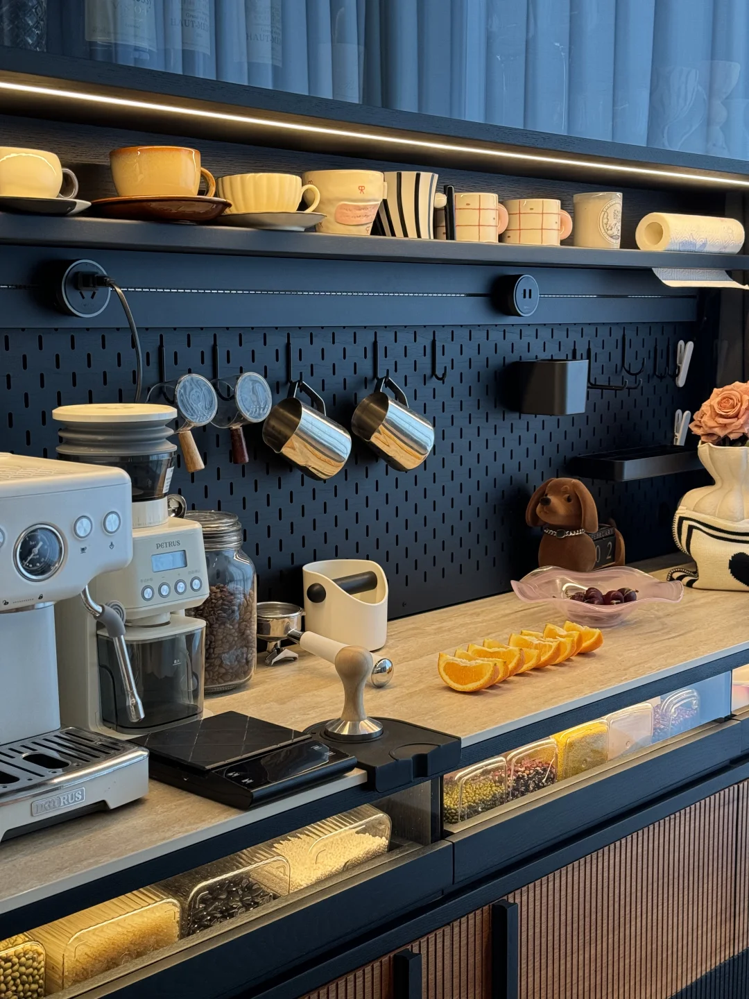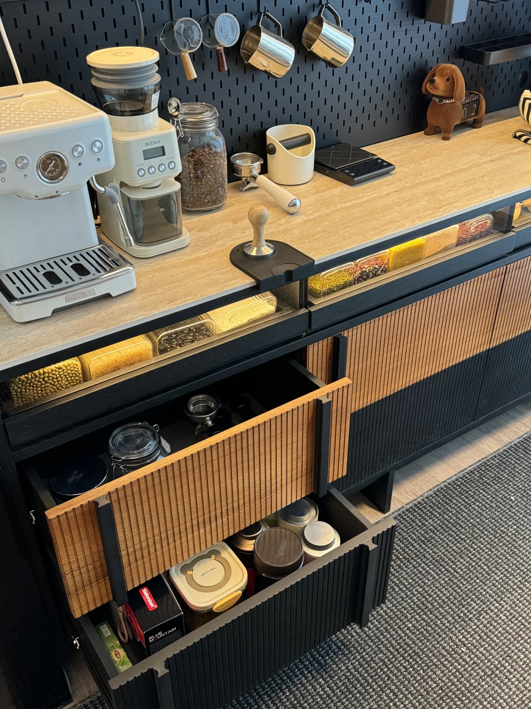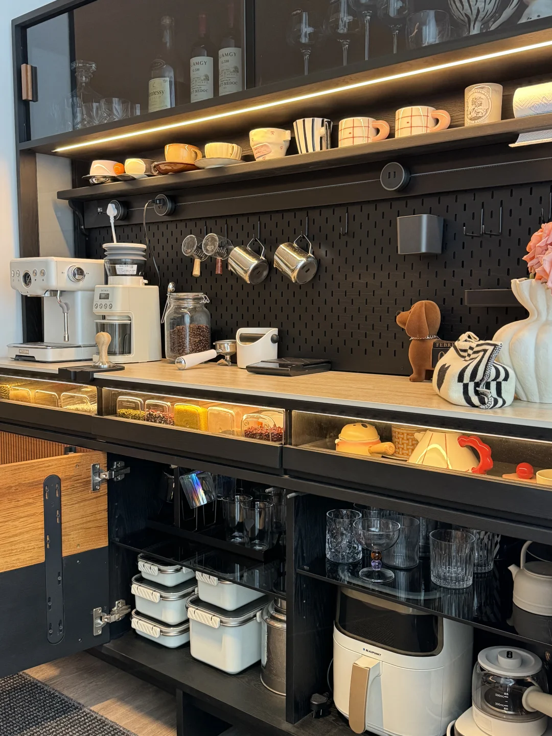 哈喽姐妹们,这里是盐盐的🏠 第一次装修就装出了Dream house ,套内215平的家,我选择把阳台封窗扩大,真的干净又舒服呀~ 我在阳台处安排了一个1.8米的梵也纳序餐边柜,我心心念念的餐边柜终于成功下车!这个颜值真的让人赏心悦目!越看越喜欢🥰 黑色白蜡木和缅甸柚木的撞色搭配复古味十足,高级又沉稳,收纳功能很强大,满足日常的使用,咖啡角、水吧台、收纳等等…… 大容量的储物柜+两个深抽屉,储物力MAX,下层玻璃层板还能调节,对摆放的不同物品不限制,囤货的零食、五谷杂粮、不常用的厨具收纳得整齐有序!一整个舒适 实木洞洞板,摆放很灵活,再搭配上公牛超长轨道插座嵌入柜体,简洁又高级,插座随意调整位置,小家电随用很方便~ 台面洞石岩板防水、耐高温,很耐造、日常打理很省心 上层玻璃柜,可以当展示柜也可以储放酒类🍹 还有隐藏的暖光灯带在置物架上和透明展示抽屉上,触摸开关打开,漫反射晕开,温馨又有格调…… 家里因为有了纳序餐边柜,我也拥有了一个实用又具有氛围感的休闲咖啡角,真的很幸福😊