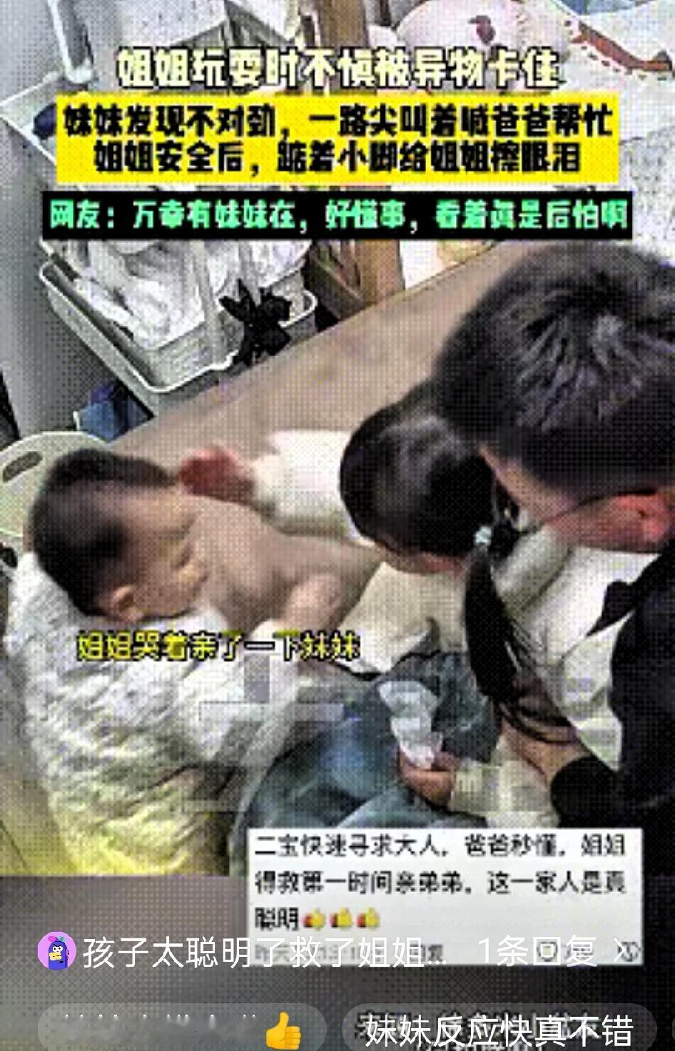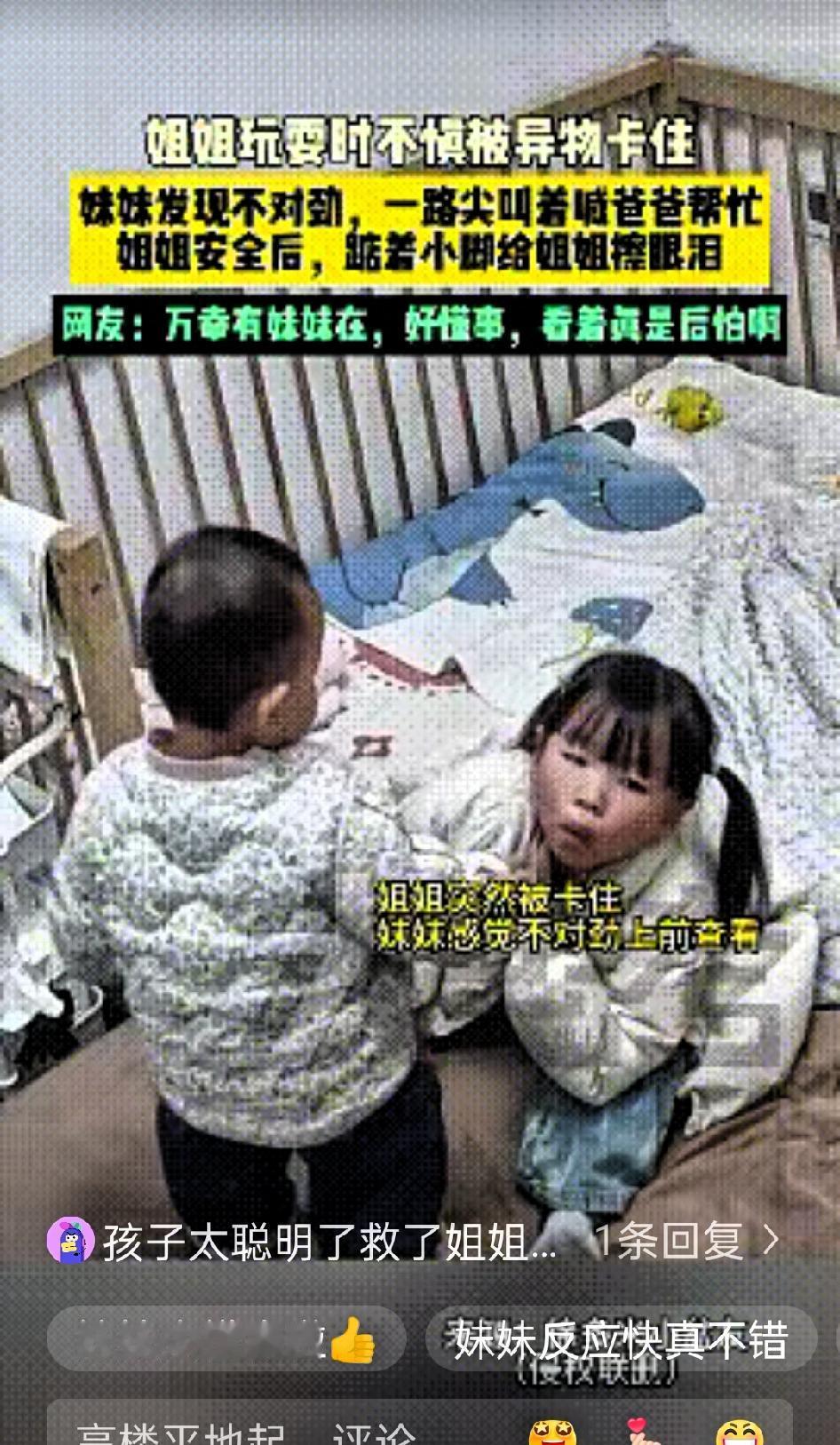 浙江,俩姐妹在床上玩耍,而爸爸去了厕所,突然姐姐被异物卡住了喉咙,危急关头,妹妹没有像同龄孩子那样慌神大哭,反而一下子就察觉到姐姐的不对劲,立马翻身下床,一路小跑冲向厕所。 她一边跑一边扯着嗓子喊爸爸,到了厕所门口,用尽全力推开那扇对她来说不算轻的门,小手紧紧拽住爸爸的衣角,使劲往房间的方向拉。 爸爸被女儿这急切的模样吓了一跳,低头看到姐姐指着喉咙、脸色发白的样子,瞬间反应过来是异物卡喉,没有丝毫犹豫,立刻用上了海姆立克急救法。 几下按压过后,卡在姐姐喉咙里的食物终于被吐了出来,所有人都松了一口气。姐姐被吓得哇哇大哭,妹妹还特别懂事地凑过去,用胖乎乎的小手帮姐姐擦眼泪,嘴里还轻声细语地安慰着。姐姐哭着哭着,突然凑上前,给了妹妹一个甜甜的吻,这个画面真的特别戳人。 想想都后怕,要是妹妹反应慢一点,或者慌了神只会哭闹,后果真的不堪设想。这件事里,最亮眼的不只是妹妹的冷静勇敢,更关键的是爸爸会正确的急救方法,才能在黄金时间里救下孩子。 很多家长总觉得意外离自己很远,其实孩子边玩边吃东西、嘴里含着小物件,都是藏在身边的安全隐患。安全教育真的要从小抓起,家长更要熟练掌握海姆立克急救法,关键时刻真的能救命。