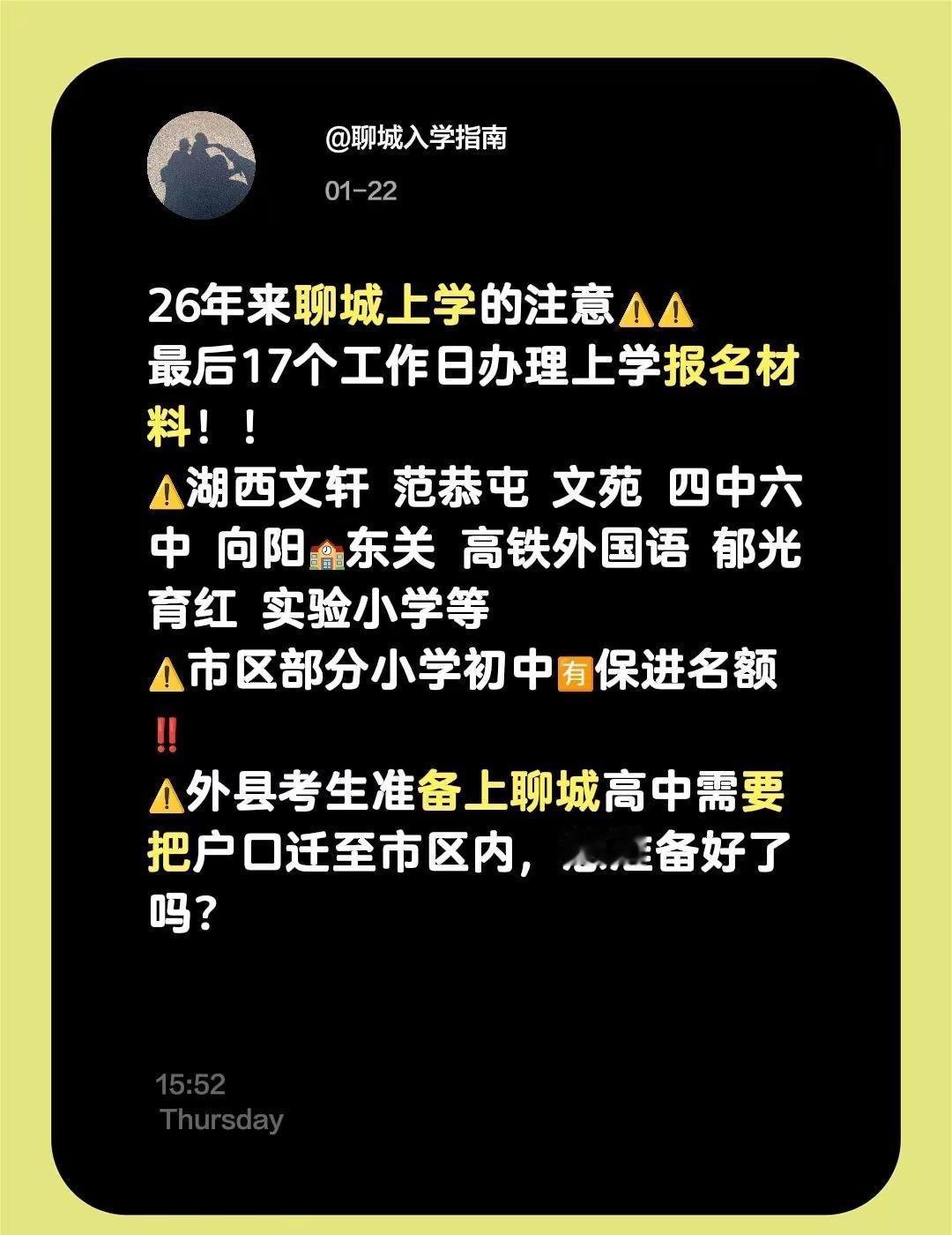 我评论了@聊城入学指南 的作品:26年来聊城上学的注意⚠️⚠️最后17个工作日办理上学报名材料!!⚠️湖西文轩 范恭屯 文苑 四中六中 向阳🏫东关 高铁外国语 郁光 育红 实验小学等⚠️市区部分小学初中🈶保进名额‼️⚠️外县考生准备上聊城高中需要把户口迁至市区内,您准备好了吗?