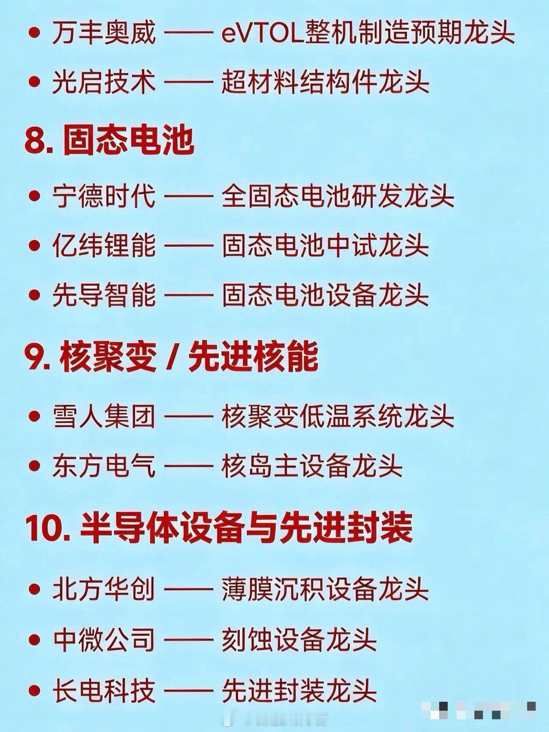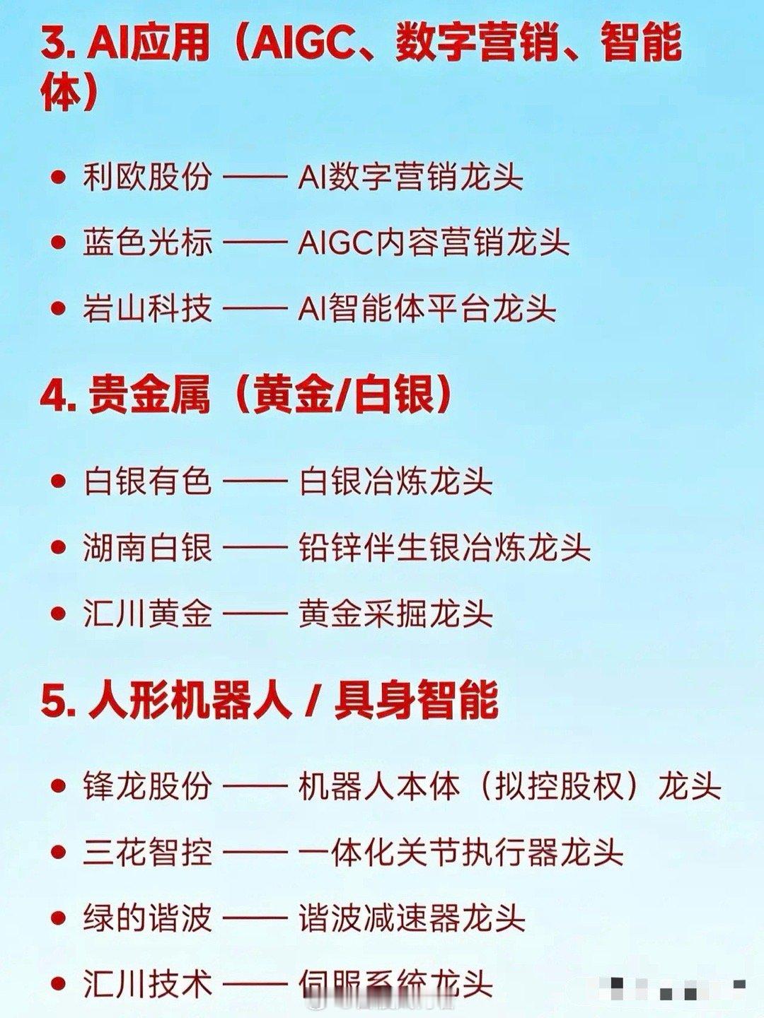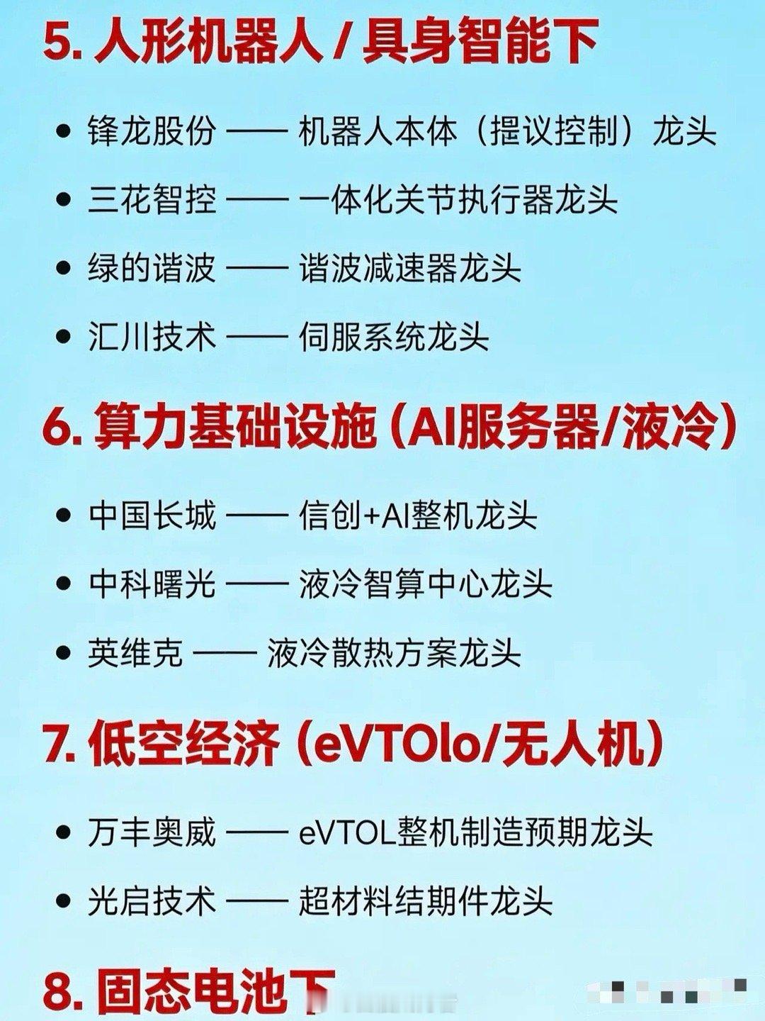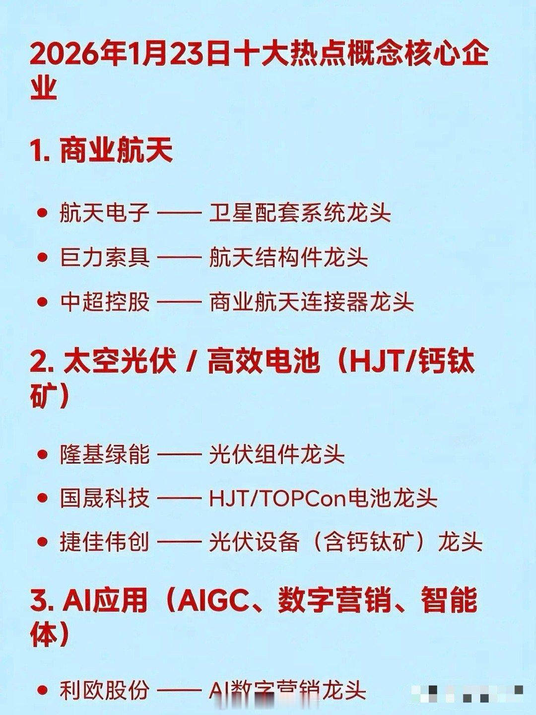 2026年1月23日十大热点概念及核心企业梳理,覆盖当下最具爆发力的赛道,每一条主线都暗藏产业风口逻辑:1. 商业航天◦ 航天电子:卫星配套系统核心供应商,从通信到控制全链条覆盖,深度绑定航天发射任务。◦ 巨力索具:航天结构件隐形冠军,火箭箭体连接、卫星支架等关键部件技术领先。◦ 中超控股:专攻航天专用连接器,在耐高压、抗辐射领域筑起技术壁垒。2. 太空光伏/高效电池◦ 隆基绿能:光伏组件全球市占率第一,HJT电池量产效率突破27%,太空光伏地面测试领先。◦ 国晟科技:HJT与TOPCon双路线并行,钙钛矿叠层技术进入中试阶段。◦ 捷佳伟创:光伏设备全能选手,钙钛矿镀膜机已供货头部企业,设备国产化核心推手。3. AI应用◦ 利欧股份:AI数字营销龙头,旗下平台可实现百万级短视频自动化生成,服务超500家品牌。◦ 蓝色光标:AIGC内容生产标杆,图文、视频、虚拟人全场景覆盖,营销转化率提升30%+。◦ 岩山科技:AI智能体平台先行者,已落地教育、金融等6大场景,用户数破千万。4. 贵金属◦ 白银有色:国内最大白银冶炼商,年产能超万吨,光伏银浆原料供应占比达25%。◦ 湖南白银:铅锌矿伴生银提取技术领先,综合回收率超98%,成本较同行低10%。◦ 山东黄金:国内黄金开采龙头,坐拥6座超大型金矿,年内新增储量150吨。5. 人形机器人/具身智能◦ 锋龙股份:拟收购机器人本体企业,聚焦家庭服务场景,样机已完成跌倒自主起身测试。◦ 三花智控:一体化关节执行器市占率超60%,精度控制达0.1毫米,适配主流机器人机型。◦ 绿的谐波:谐波减速器国产替代主力,寿命突破1.2万小时,打破日本哈默纳科垄断。◦ 汇川技术:伺服系统响应速度提升至0.01秒,人形机器人专用款已批量供货。6. 算力基础设施◦ 中国长城:信创AI服务器市占率第一,搭载自研芯片,支持国产操作系统全适配。◦ 中科曙光:液冷智算中心落地8座,PUE低至1.08,单机柜功率密度突破50kW。◦ 英维克:液冷方案覆盖90%以上智算中心,冷板式、浸没式双技术路线领跑。7. 低空经济◦ 万丰奥威:eVTOL原型机完成千次试飞,续航突破300公里,计划年内取得适航认证。◦ 光启技术:超材料机身部件使无人机减重40%,抗风等级提升至12级,适配多型号低空飞行器。8. 固态电池◦ 宁德时代:全固态电池能量密度达500Wh/kg,搭载车型续航突破1500公里,2026年量产。◦ 亿纬锂能:半固态电池已装车测试,循环寿命超3000次,中试线产能扩至10GWh。◦ 先导智能:固态电池叠片机速度提升至20片/秒,设备良率超99%,供货宁德、亿纬等头部企业。9. 核聚变/先进核能◦ 雪人集团:核聚变低温系统核心供应商,-270℃超低温制冷技术独步全球,服务国际热核聚变项目。◦ 东方电气:核岛主设备市占率超70%,四代核电反应堆压力容器研发进入收官阶段。10. 半导体设备与先进封装◦ 北方华创:薄膜沉积设备覆盖14nm至3nm工艺,国产化率突破40%,2025年营收同比增80%。◦ 中微公司:5nm刻蚀机量产交付,3nm设备进入验证阶段,全球市占率升至15%。◦ 长电科技:Chiplet封装出货量破10亿颗,3D IC先进封装技术获苹果、华为订单。这些核心企业要么占据技术高地,要么垄断市场份额,既是赛道的领跑者,也是产业趋势的风向标,值得重点关注其技术突破与产能释放节奏。
