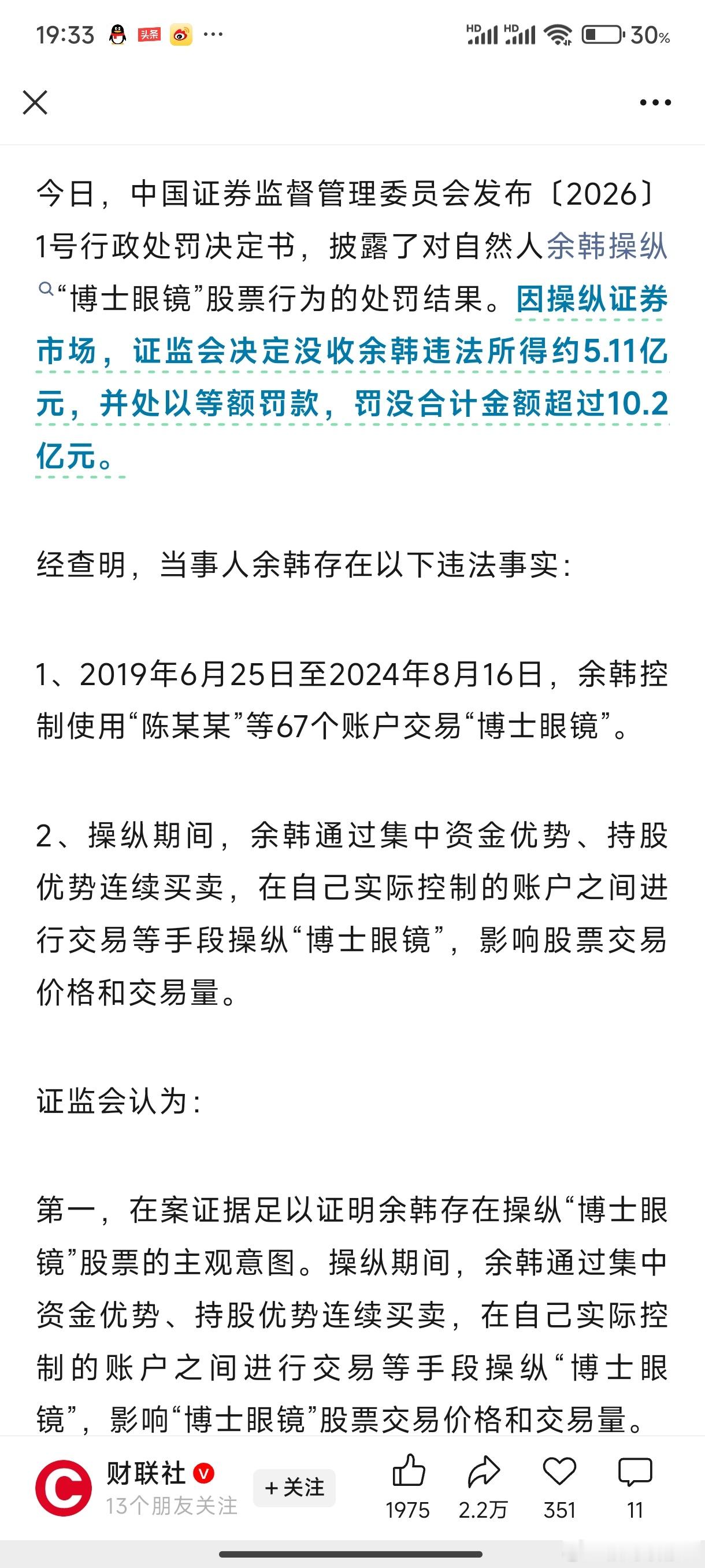 操纵67个账户被罚没超10亿余韩的操纵行为对“博士眼镜”价量产生明显影响。操纵期间“博士眼镜”股票价格从13.72元每股上涨至37.81元每股,涨幅达175.%。没一罚一,警钟🕰️