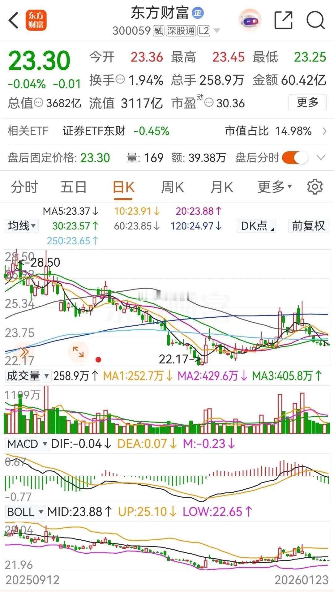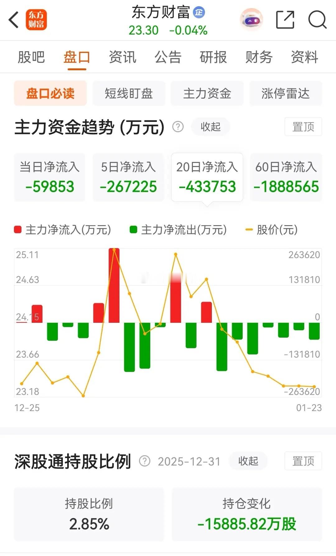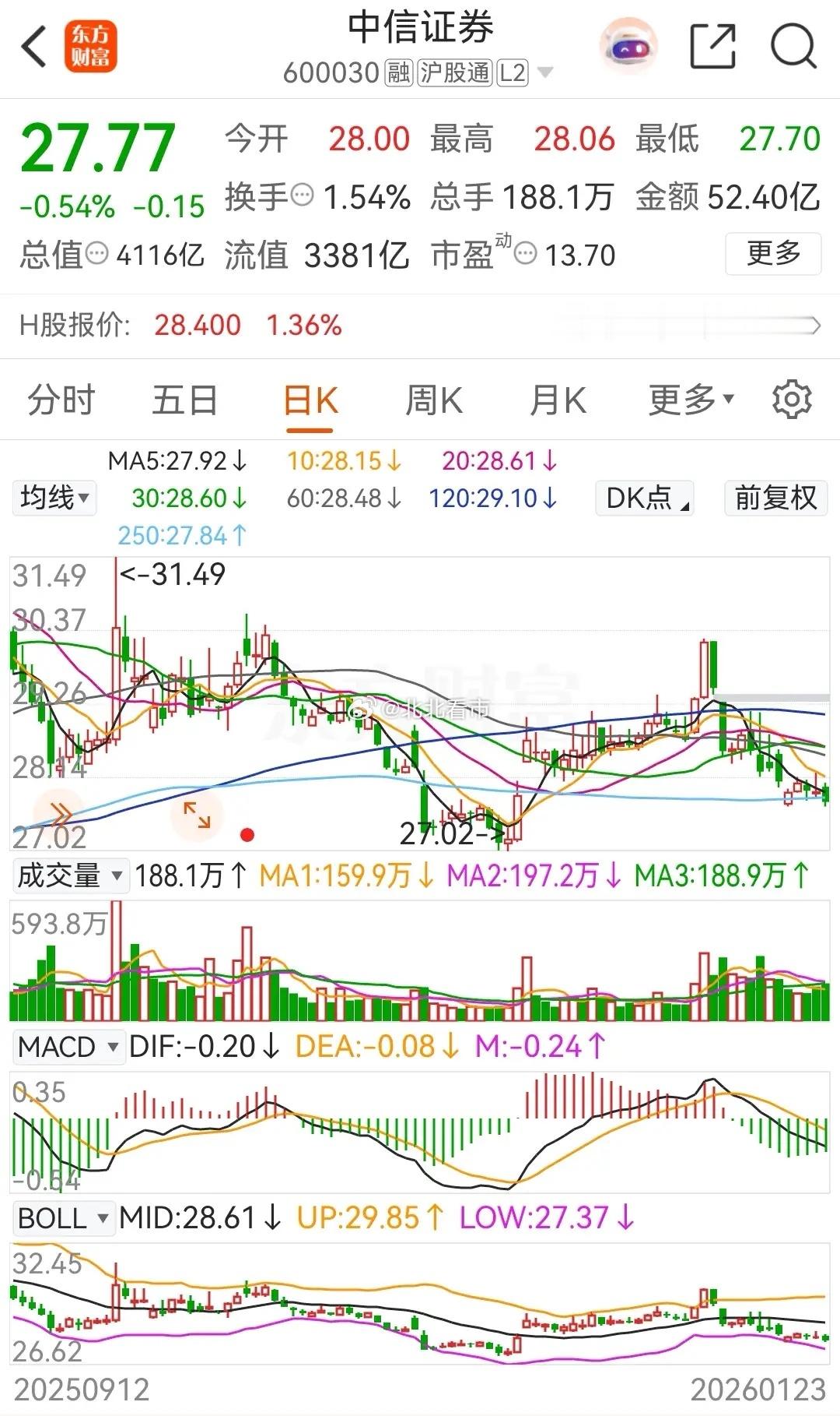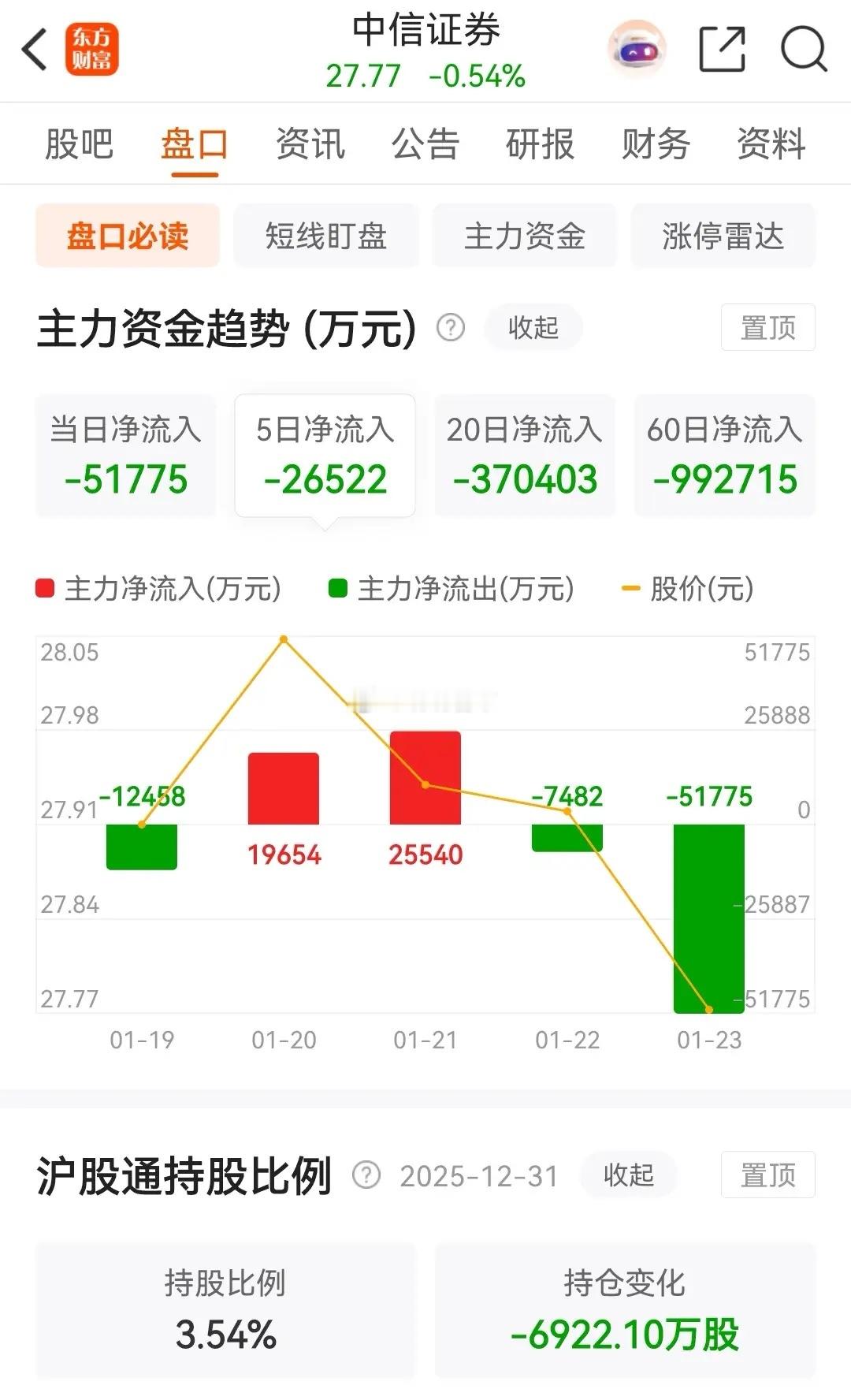 东方财富连续连续九天调整,被主力资金连续七天净卖出,年内的涨幅缩水为0.52% ;中信证券则连续14天调整,年内的涨幅为-3.27%;券茅和券商一哥虽然刚开年两天都是连续拉涨,但是后面得日子也太惨了,被压制的很厉害。东方财富今天的走势是高开小幅冲高后震荡走低,收盘时跌了0.04%,报价23.30元。在资金流向上,今天被主力资金大幅净卖出了5.9893亿元,本周的累计净卖出金额为 26.7225亿元。从走势上看虽然暂时下跌速度减缓,但还得等止跌阳线出现了才能确认。中信证券今天的走势是高开震荡后一路走低,收盘时跌了0.54%,收报于27.77元。在资金流向上,今天被主力资金大幅净卖出了5.1775亿元,近五个交易日则是被主力资金合计净卖出了2.6522亿元。从走势上看,目前依然是处于破位下行态势之中。至于更加详细的技术分析,可以查看上一篇中关于券商概念板块的走势分析。对于券茅和券商一哥来说,目前的核心矛盾就是,历史新高业绩与持续阴跌的股价。在2025年,中信证券全年净利润300.5亿元(同比增长38%),东方财富虽未披露全年数据,但前三季度净利润90.97亿元(同比增速超50%),均创历史新高。然而股价表现疲软:2025年东方财富年跌幅10.02%,中信证券年线收出十字星(微跌0.62%);截至2026年1月份,二者股价较2024年高点仍差距超20%(中信证券差了-24.93%,东方财富差了-23.51%) ,与同期沪指11.97%的涨幅形成鲜明反差。