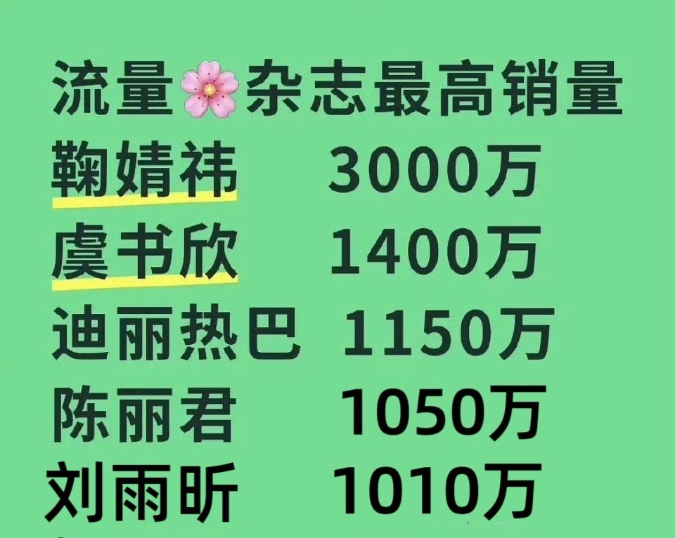 女星最高杂志销售额排名目前只有5个破千万的