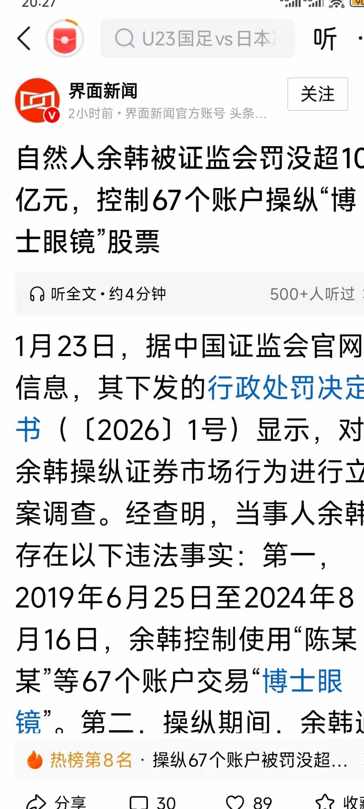 大新闻,绝对是今天市场最大的新闻。今天最大的新闻不是商业航天满屏涨停,而是盘后村里开出的一张对自然人余某超过10亿的天价罚单!此外对金某、瑞丰达及关联私募也进行了重罚,建议你们自己去仔细阅读下原文,信息量很大。宝子们,你们嗅到什么了没有?这信号非常明显了,监管是越来越紧了。对于游资主导的暴涨爆炒无实际业绩的股票是最危险了,你们赶紧理一理是不是持有这种票?管理层是不希望股市大涨大跌的,这种利用不同的账户集中拉抬股票,助推股市暴涨暴跌是管理层所不能容忍的。结合今天上证四次利用上证50、沪深300集中抛售打压指数的行为,我们就更要注意,慢牛才是这轮牛市的形态。余韩操纵证券市场被罚没超10亿