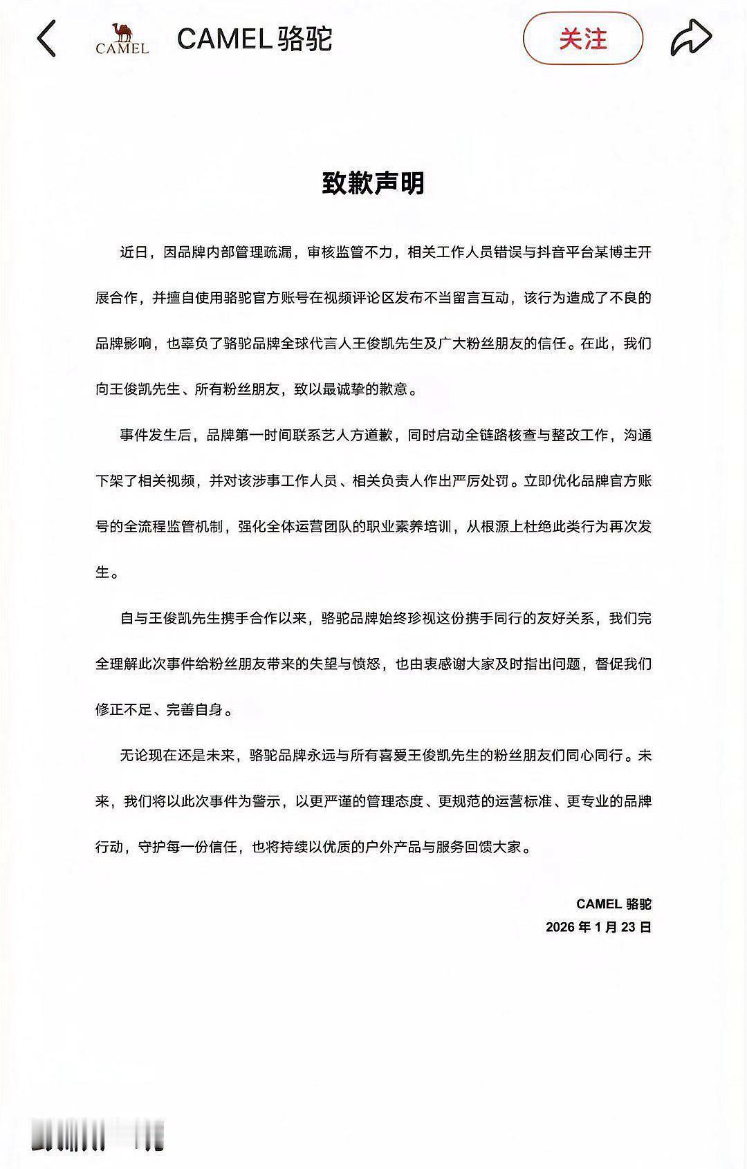 骆驼品牌方向王俊凯致歉 骆驼品牌因运营失误致歉,如何修复与王俊凯及粉丝的关系? 近日,骆驼品牌因内部管理疏漏,在抖音平台上与模仿王俊凯的网红合作,发布不当言论,引起轩然大波。 品牌迅速发布致歉声明,称将优化监管机制,但未加盖公章,引发粉丝质疑其诚意。此次事件不仅损害了品牌的公信力,也令王俊凯及其粉丝感到失望。骆驼品牌表示将加强内部审核,避免类似事件再次发生,并承诺全面整改,力求重建信任。