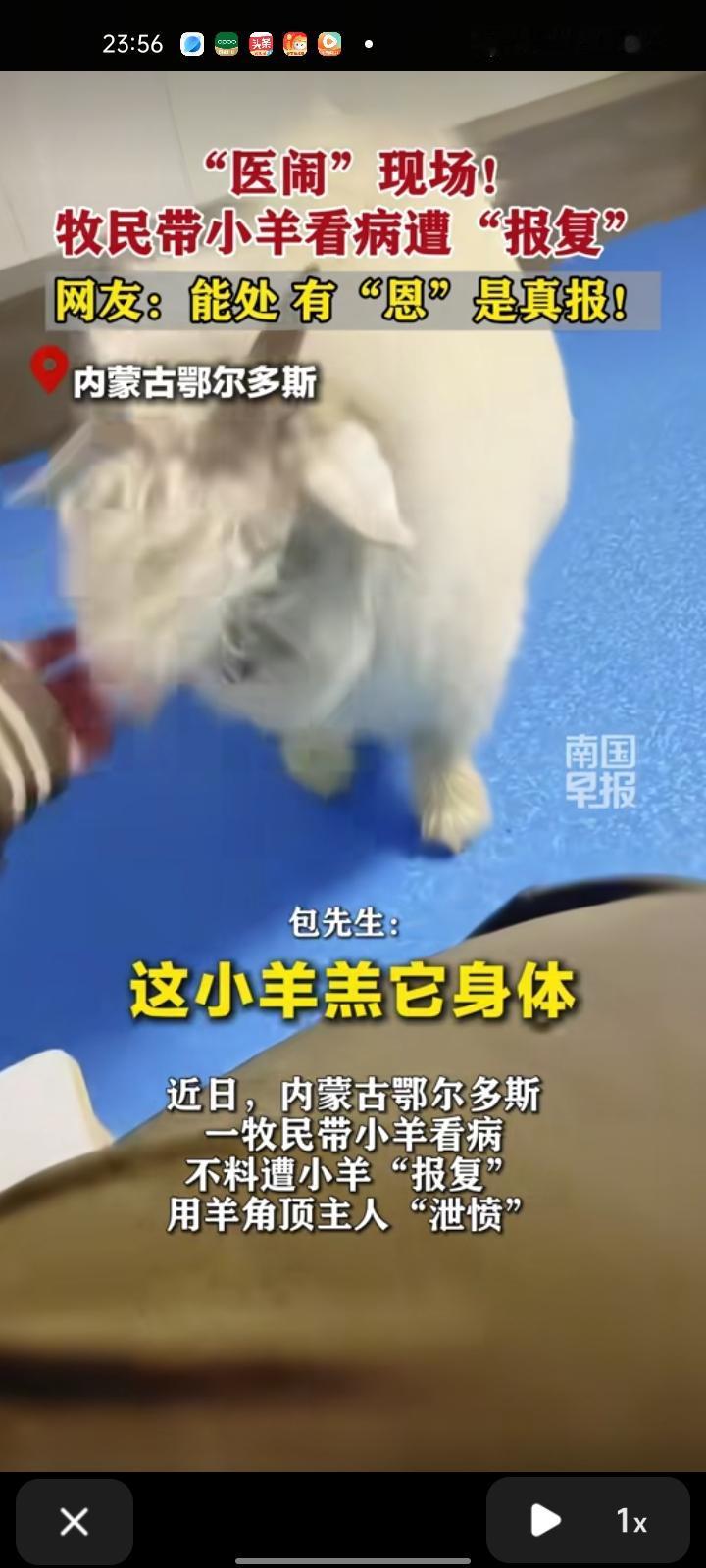 1月18日,内蒙古鄂尔多斯。网友发视频称,小羊身体不舒服,自己带着小羊到医院看病,不料遭小羊“报复”,被羊角顶撞泄愤,当时感觉挺可爱。 有网友称,能处,有“恩”事真报