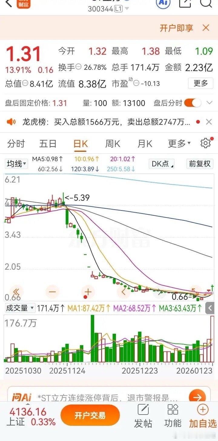 这走势,是要酝酿一波反攻了吗?从高位一路下挫,跌幅超70%,股价跌破1元关口后,多头终于吹响反攻号角,连续拉出四根大阳线,强势将股价拽回1元关口上方。这样的走势,实属罕见。回顾过往行情,这只票即便在1元附近反复震荡,也往往很快被空头力量压制回落;极少出现股价下探至0.5—0.6元区间后,仅用短短四五天,就强势收复1元关口的情况。这足以印证,场内多头并未彻底缴械,仍在通过各种操盘动作,试图将股价拽回良性运行轨道。背后或许暗藏未被市场捕捉到的逻辑,但毋庸置疑,这正是多头奋力护盘的真实写照。眼下,股价不仅一举突破长期下行通道的压制,更强势站上五日线等多条均线,技术面形态初步转好。接下来的关键,就看多头能否在上方阻力位前,扛住空头的抛压攻势。后续博弈大概率依旧艰难,一旦多头攻势乏力,股价或将再度坠入下行通道,操作上切不可掉以轻心。