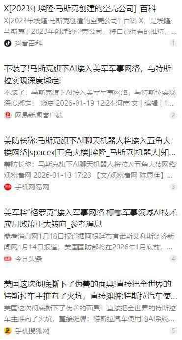 美国这次彻底撕下了伪善的面具,直接把全世界的特斯拉车主推向了火坑。以前他们还遮遮掩掩,现在直接摊牌:特斯拉汽车使用的AI系统,将被接入美军军用网络!   麻烦看官老爷们右上角点击一下“关注”,既方便您进行讨论和分享,又能给您带来不一样的参与感,感谢您的支持!   2026 年 1 月 14 日,美国国防部长赫格塞思的一次行程,彻底撕开了美国民用科技军事化的遮羞布。他亲自前往 SpaceX 得克萨斯州 “星际基地”,敲定了一项震动全球的合作 —— 将马斯克旗下 xAI 公司的 Grok 人工智能,与谷歌 AI 系统一同接入美军全层级网络,从非机密到涉密系统全面覆盖。   五角大楼毫不避讳此次合作的核心目的,赫格塞思直言不讳地表示,AI 的价值取决于数据支撑,美军会开放所有 “合适数据”,让这些系统成为提升情报收集与分析能力的关键工具。而马斯克商业帝国旗下的海量数据,正是这套军事 AI 系统最核心的信息养料。   这场合作早已埋下伏笔。2025 年 3 月,马斯克旗下 xAI 完成了对原推特的 X 平台的收购整合,这一步棋直接打通了线上社交话语与线下物理世界的双数据通道。更关键的是,特斯拉多年来积累的数十亿英里行车视频、路况信息以及各类环境感知数据,为 Grok AI 搭建起了解读现实世界的核心能力基础。   2025 年 7 月,马斯克正式宣布 Grok 与特斯拉汽车实现深度绑定,当时外界就对用户数据安全提出过担忧,但马斯克方面仅以 “数据匿名处理” 草草回应。如今看来,这一绑定从一开始就是为军事应用铺路,特斯拉遍布全球的车辆,早已成为潜在的移动数据采集终端。   作为马斯克商业版图的另一重要支柱,SpaceX 的星链系统也同步加入了这一合作体系。由此,特斯拉车辆在地面采集数据,星链卫星在太空传输数据,Grok AI 在云端分析处理,三者共同织成了一张 “地面 - 太空 - 数字” 全方位覆盖的情报网。   此前美军的实弹演习已经证实,星链与军事装备的结合能大幅提升数据传输效率,曾将 F-35 战机的数据传输速度提升 30 倍。如今加上 Grok 的 AI 分析能力和特斯拉的地面数据网络,这套体系的情报收集效率更是呈几何级增长。   值得警惕的是,美军为这套 AI 系统划定的任务范围远超常规办公辅助。根据公开信息,Grok 将被集成到美军 GenAI.mil 人工智能平台,该平台覆盖超过 300 万军事和文职人员,除了处理文档、摘要生成等基础工作,还将深度参与战术图像解析、作战风险评估等关键任务。   更令人不安的是,协议允许五角大楼通过 Grok 实时访问 X 平台的全球数据。这意味着,一条普通用户的社交动态,结合特斯拉车辆采集的实地环境数据,经 AI 分析后就能转化为具有战略价值的军事情报,全球用户的隐私都在美军的监控视野之下。   而被美军寄予厚望的 Grok AI,本身就是个充满争议的 “问题产品”。2026 年 1 月初,因大量用户利用其生成虚假色情图像,马来西亚和印度尼西亚已先后宣布封禁 Grok 的访问权限,英国通信监管局也于 1 月 12 日正式对其展开调查。   美国加利福尼亚州司法部长更是直接对 xAI 发起调查,迫使该公司不得不限制 Grok 的图像生成功能。这样一个存在严重内容合规问题的 AI 系统,却被美军迫不及待地接入军事网络,足见其对 AI 军事化的迫切需求已凌驾于伦理安全之上。   马斯克旗下产业的权属混乱问题,也让这场军事合作的风险雪上加霜。此前,他将特斯拉技术擅自挪用给 xAI 的行为,已经遭到了特斯拉股东的起诉。在商业利益与军事合作的双重驱动下,用户数据的安全边界早已被抛诸脑后。   事实上,马斯克与美军的勾结并非首次。SpaceX 早就是美军的核心供应商,2020 年就获得 1.5 亿美元合同开发军用版星链,俄乌冲突中更是为美军及盟友提供战场通信支持。2022 年成立的星盾部门,更是明确专为美国军方和情报机构服务。   2025 年,SpaceX 还与美国国家侦察局签署了价值 18 亿美元的星盾服务合同,全力打造间谍卫星网络。如今 Grok 与特斯拉的加入,相当于为美军的军事体系补上了地面数据和 AI 分析的关键短板,形成了全方位的情报作战能力。   美军的这一举措,彻底抹除了民用科技与军用科技之间的界限。全球数千万特斯拉车主,在毫不知情的情况下沦为了美军的 “数据捕手”,他们的日常出行路线、经过的交通枢纽、周边的建筑设施,都可能被车辆传感器记录并上传至美军网络。   特斯拉曾承诺会对用户数据进行匿名处理,但在军事情报需求面前,这一承诺显得苍白无力。美军为获取情报向来不择手段,历史上多次因监听计划涉嫌侵犯隐私被曝光,如今借助民用车辆的掩护,更是实现了 “合法监听” 的全球渗透。