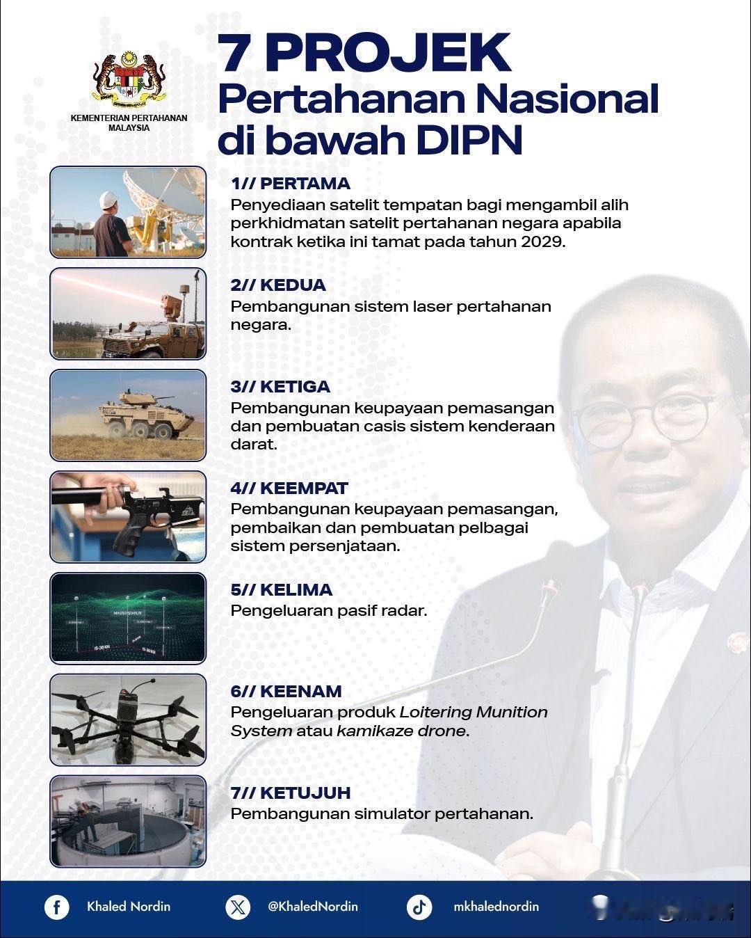 马来西亚国防部部长穆罕默德·哈立德·诺丁(Mohamed Khaled Nordin)近日发帖介绍了马来西亚国防部在国家国防工业政策 (DIPN) 下启动的七个项目。这些项目旨在加强马来西亚的国内工业能力,并减少对外国供应商的依赖。 七个国家国防项目包括: 第一、开发本地卫星,在当前合同于 2029 年到期后接管国家国防卫星服务。 第二、开发国家激光防御系统。 第三、具备陆地车辆底盘的组装和制造能力。 第四、具备各种武器系统的组装、维修和制造能力。 第五、生产无源雷达。 第六、生产游荡弹药系统(Loitering Munition System),即“神风敢死队”无人机。 第七、开发国防模拟器。 这些举措是马来西亚建立一个自力更生、可持续和有弹性的国内国防工业的长期战略的一部分。