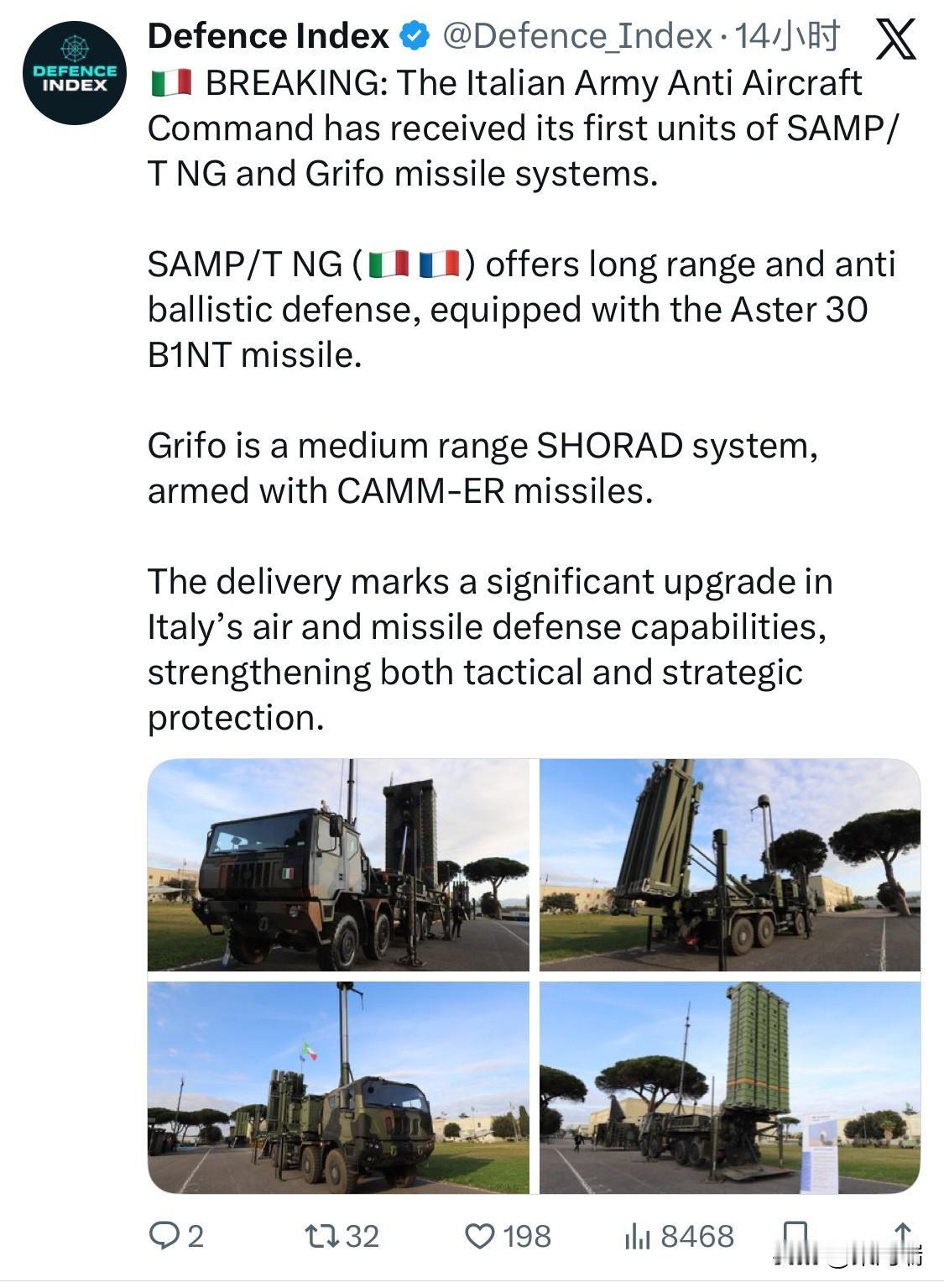 突发新闻:意大利陆军防空司令部已接收首批 SAMP/T NG 和 Grifo 导弹系统。 SAMP/T NG( 🇮🇹🇫🇷 )提供远程和反弹道防御,配备 Aster 30 B1NT 导弹。 Grifo 是一款中程近程防空系统,配备 CAMM-ER 导弹。 此次交付标志着意大利防空和导弹防御能力的重大提升,加强了战术和战略防护。 截至 2026 年 1 月,SAMP/T NG 和 Grifo 是意大利陆军构建多层综合防空系统的两大核心支柱。这两个系统分别负责不同层次的防御任务,并于 2026 年 1 月正式交付意大利陆军服役。 1. SAMP/T NG(新一代中远程防空导弹系统) SAMP/T NG(New Generation)是由 Eurosam 财团(由法国 MBDA、意大利 MBDA 和泰雷兹 Thales 组成)研制的中远程地对空导弹系统,是现役 SAMP/T 的重大升级版。 核心作战能力:具备防御飞机、巡航导弹及战术弹道导弹(TBM)的能力。 导弹型号:采用全新的 Aster 30 B1NT 拦截弹。该导弹配备了先进的 Ka 波段主动导引头,最大拦截射程超过 150 公里。 雷达性能:意大利版本装备了莱奥纳多(Leonardo)公司的 Kronos Grand Mobile High Power (GMHP) 高功率 AESA 雷达,探测距离超过 350 公里(法国版使用 Ground Fire 300 雷达),能够同时跟踪超过 1,000 个目标。 系统特点:采用 360 度全向防御模式,单套系统可配备多达 6 个发射模块,准备发射导弹 48 枚。 2. Grifo(格里芬 / 狮鹫防空系统) Grifo 是意大利陆军的新一代短程防空(SHORAD)系统,属于 MBDA EMADS(增强型模块化防空解决方案)家族。 核心作战能力:主要用于保护部队和重要设施免受无人机(UAV)、低空固定翼飞机、直升机及巡航导弹的威胁。 导弹型号:使用 CAMM-ER(通用防空模块化导弹-增程型)导弹,射程超过 40 公里。 雷达与指挥:集成了莱奥纳多的 PCMI 指挥控制模块,并配备莱茵金属意大利公司的 X-TAR3D 雷达用于目标探测与跟踪。 系统特点:采用“软垂直发射”(Soft Vertical Launch)技术,可实现 360 度覆盖且发射特征极小,具备高度的机动性和快速反应能力。 3. 两者的协同关系 在意大利的防空战略中,这两个系统共同构成了多层防空网络: SAMP/T NG 提供战略级的中远程防御,专门拦截高价值目标和弹道导弹。 Grifo 提供战术级的区域防御,作为 SAMP/T NG 的补充,填补中短程空域漏洞,尤其是针对无人机群和低空精确打击武器。 截至 2026 年初,意大利陆军计划采购 6 套 SAMP/T NG 电池组和 9 套 Grifo 系统,以全面实现其防空力量的现代化。