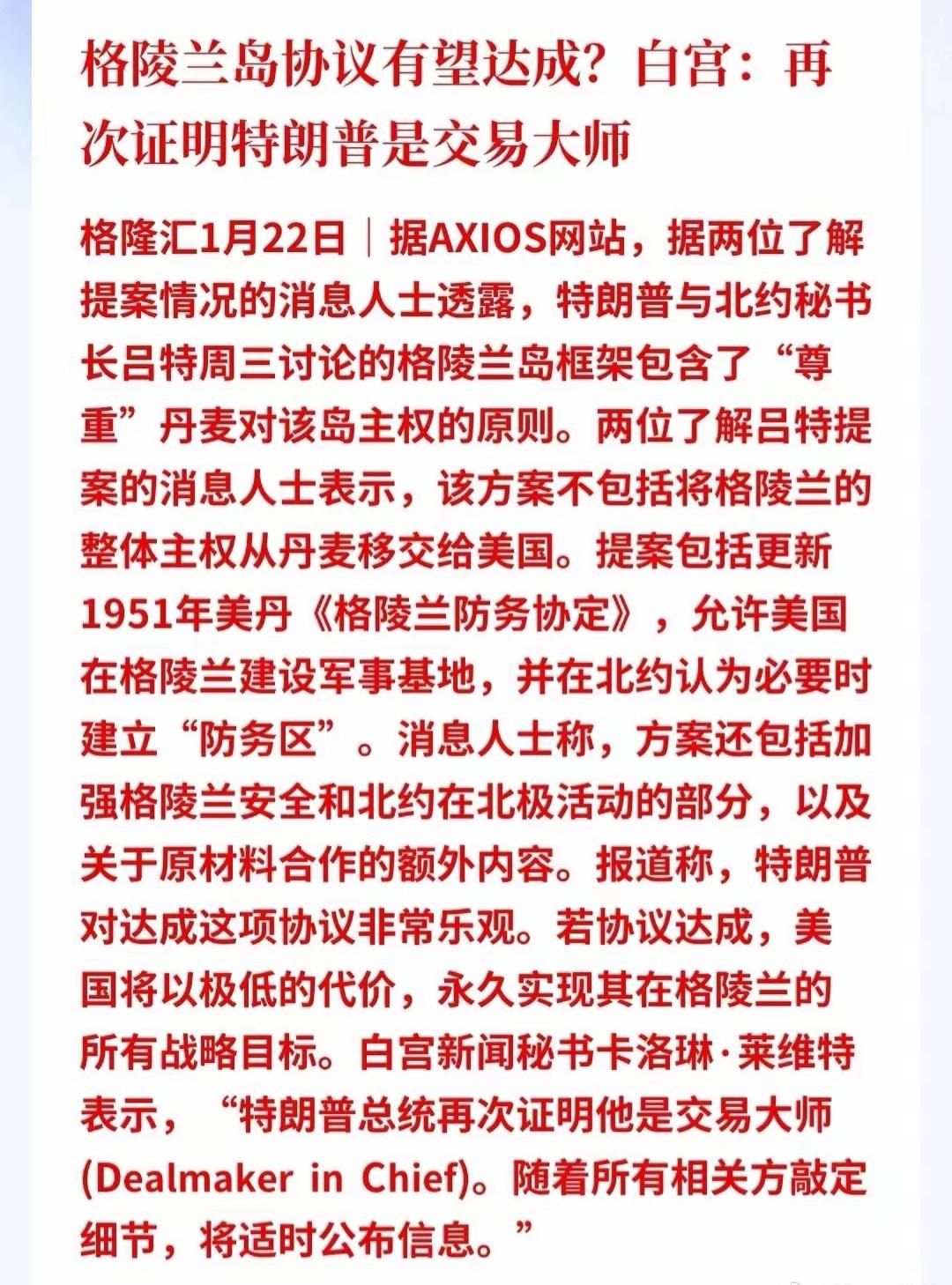 美国抢格陵兰岛算是事实控制了。就是丹麦保持名义主权,美国人自由进出格陵兰岛,且在北约名义下,美国可以做任何军事部署不需要丹麦批准。 美国在格陵兰建设军事基地,并在北约认为必要时建立"防务区"。消息人士称,方案还包括加强格陵兰安全和北约在北极活动的部分,以及关于原材料合作的额外内容。报道称,特朗普对达成这项协议非常乐观。若协议达成,美国将以极低的代价,永久实现其在格陵兰的所有战略目标。