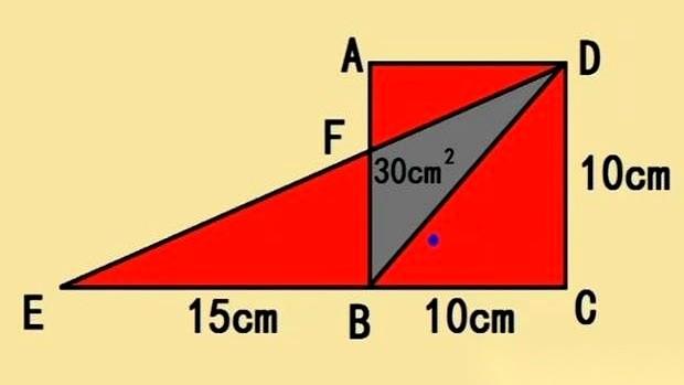 就这道小学几何题,据说第一眼看过去,不少大学生都把笔放下了。 一个边长10的正方形,旁边多出来一块三角形,面积告诉你了,是30。然后又给了一条斜边,BE长15。 让你求两个红色阴影区的总面积。 问题就出在这条斜边BE上。很多人盯着它,想用勾股定理,想算角度,脑子里辅助线画得天花乱坠,结果把自己绕进去了。 可你把图换个角度看,就一秒钟的事。 那个在正方形外面的三角形BDE,它的面积是怎么算的?底乘以高除以二,对吧? 它的底是DE,高呢?从B点垂直往下画一条线,这条高,不多不少,正好就是正方形的边长——10。 现在面积和高都有了。 面积30,高是10,那底DE的长度,不就是6吗? 算到这,图里最大的那块红色三角形ADE的面积,一下就出来了。底是AD(10)加上DE(6),高是CD(10),面积就是(10+6)×10÷2,等于80。 别急,还没完。 题目里给的那个小三角形BDE,面积是30。它和旁边那个没上色的空白三角形BDC,是同一个高(都是10),但底不一样。 空白三角形BDC的底是10,高是10,面积就是50。 现在,用那个最大的红色三角形ADE的面积80,减去空白三角形BDC的面积50,剩下的是什么? 就是那两个红色阴影区的面积之和:30。 所以说,有时候解题不是比谁算的快,是比谁看得穿。那个BE=15,从头到尾就是个烟雾弹。