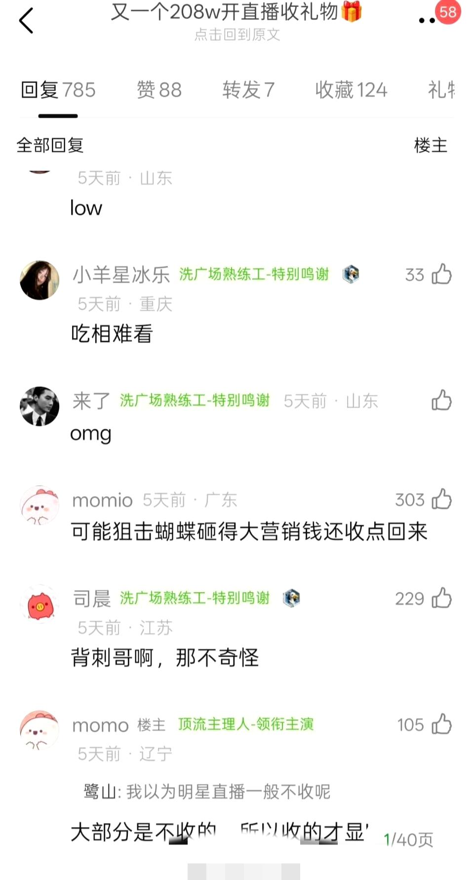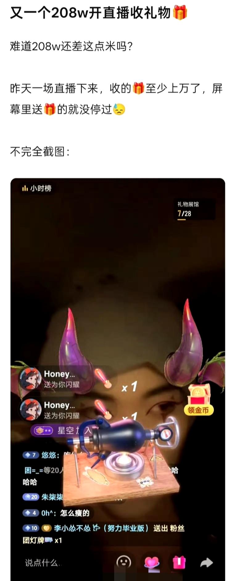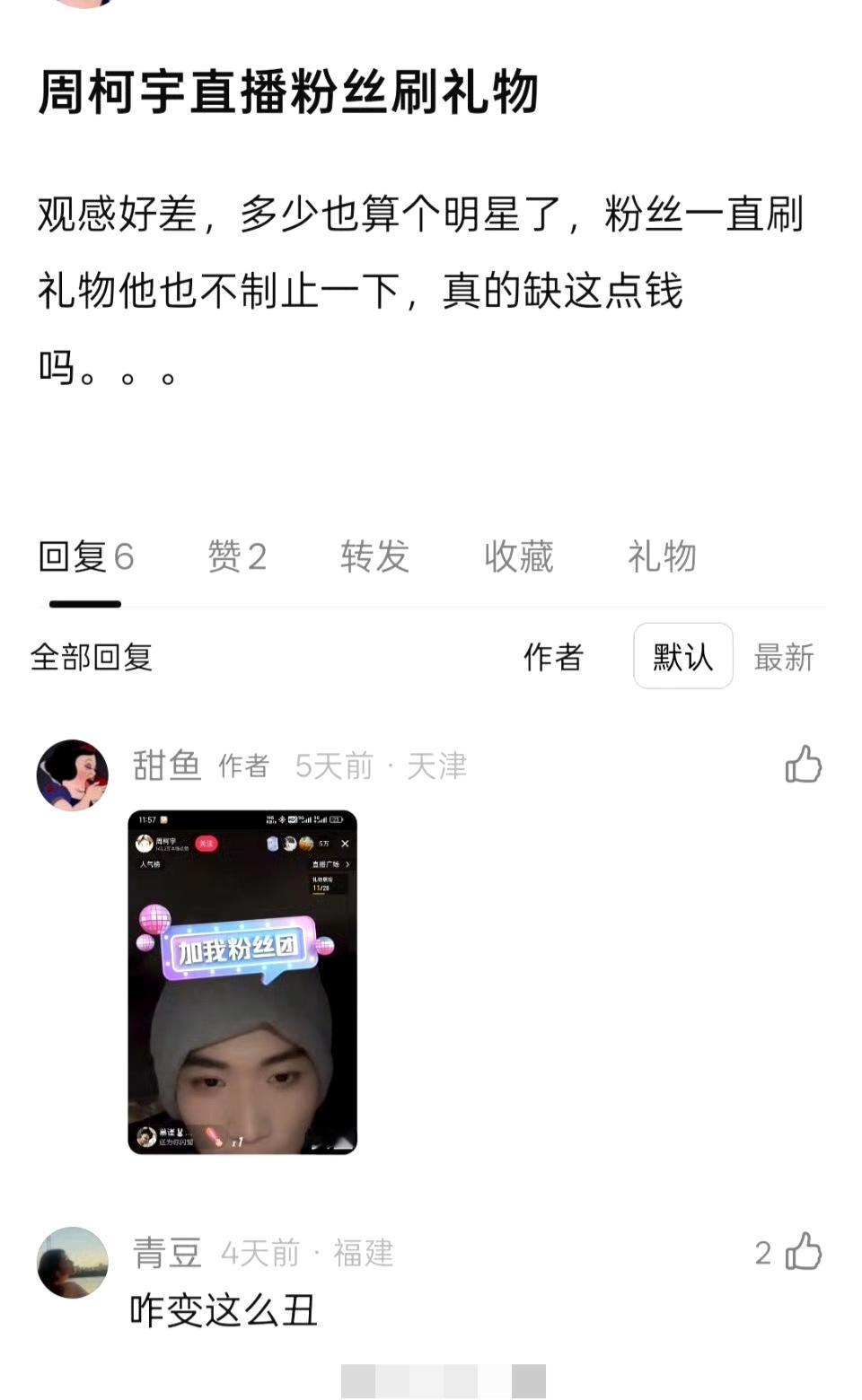 周柯宇直播收礼引争议,一句“别刷了”难堵悠悠众口 周柯宇的一场直播,让“明星直播收礼”的话题再次引发热议。 直播中粉丝疯狂刷礼物,甚至一度卡屏,他虽然说了一句“别刷礼物了,我看不见字幕了”,但全程并未关闭礼物功能,直到下播前才轻飘飘地提了一句。这与当下多数明星直播时直接关闭礼物功能的做法形成了鲜明对比。 网友们质疑:作为收入不菲的艺人,真的差粉丝刷的这点礼物钱吗?这样的“口头制止”,更像是走个过场,难以平息大家对明星直播收礼的争议。