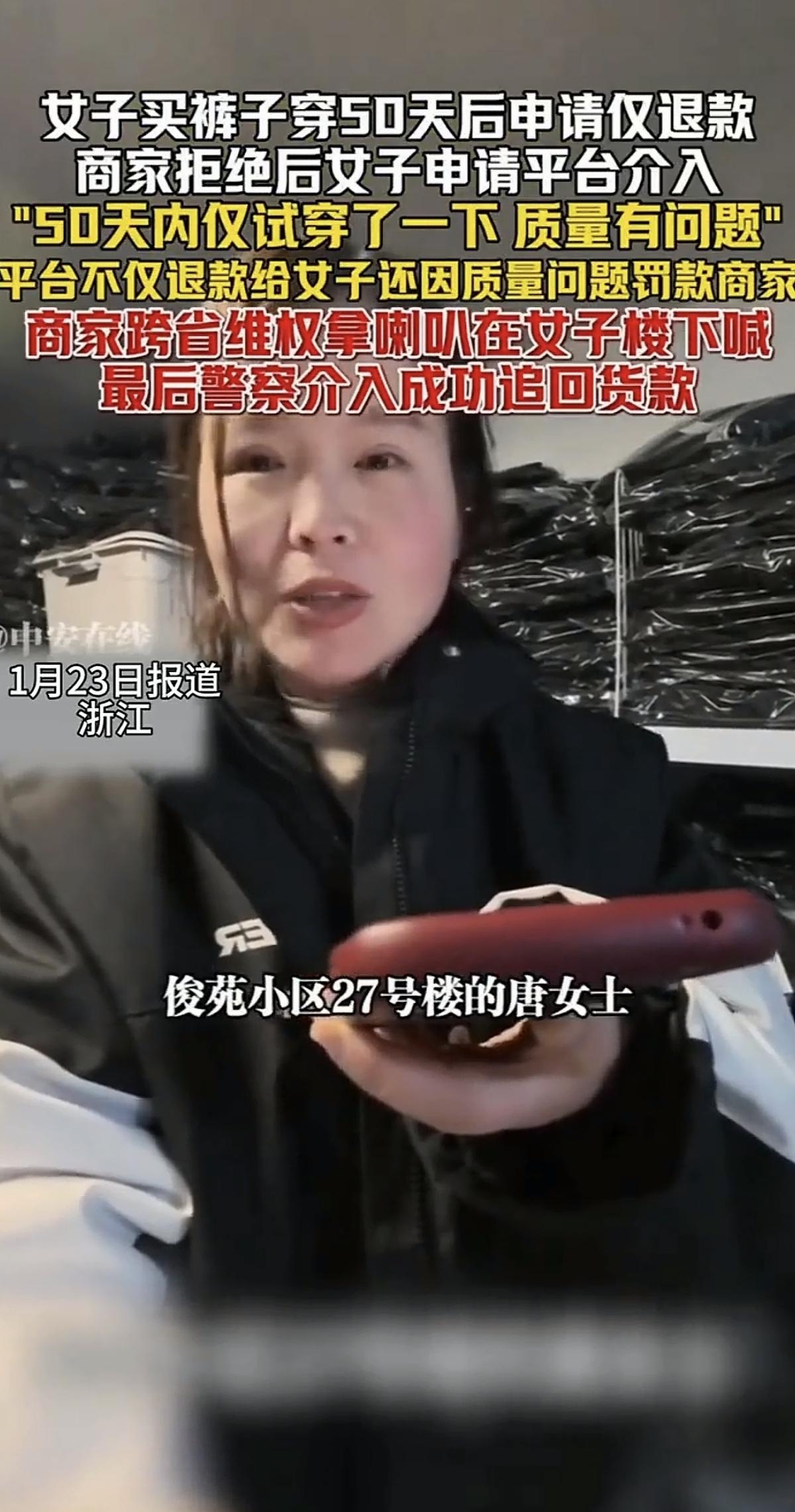 先不说唐女士买了那条裤子穿过没有,50天了,还要退货? 做服装这一行的,库存是大事,因为有服装有季节性。 过季的服装变成了压箱底的旧货,基本就是砸手里了,还怎么经营? 所以,50天过去了,唐女士的退货申请是过分的。 要退货,不是应该是7天内吗? 对于唐女士这样的申请,店铺老板当然不同意,但唐女士玩了一招更决绝,那就是让平台介入,仅退款。 不让退货? 那就连货都不退了,但买裤子的钱却要拿回来。 同时,店铺老板还被平台罚款6元。 这不是欺负人吗? 如果唐女士可以这样做,那么章女士、李女士也应该可以,那么,平台上的这些商家还怎么经营下去呀! 店铺老板忍无可忍,决定跨省追款,到唐女士家楼下用喇叭喊话。 这可糗大了! 结果是店铺老板追回了货款。 一条裤子是小事,但这关系到买卖双方的信任。 “无理由退货”是商家给消费者的权益,为的是让消费者买得放心,而这份信任不应该被滥用,让“薅羊毛”有了名正言顺的借口。 如果唐女士下次再到该店铺下单,估计店铺老板应该不会做这笔生意了。