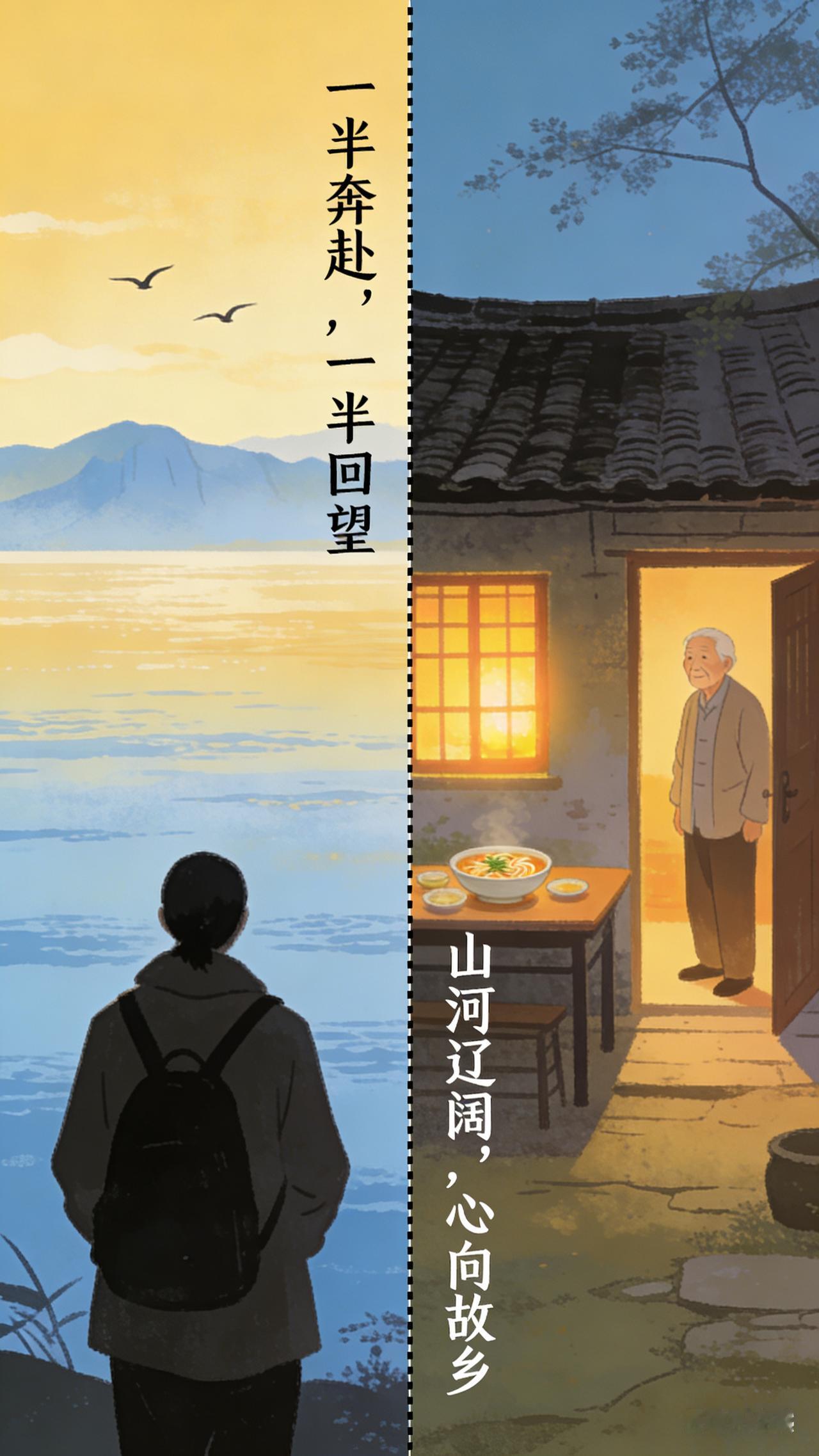 山河辽阔,心归故乡 山河辽阔,不过是脚步丈量的远方,心之所向的故乡。 总想着翻山跨海,探天地浩大,把远方的风景,揉进岁月山河。 步履所至,拓宽目光,也沉淀内心的丰盈。 可走得再远,回头望,总有一处柔软牵挂。 是故乡的烟火,老屋的窗,温热的羹汤,熟悉的乡音。 它藏在心上,念起,便有归处。 原来万里山河,远方让我们成长,故乡让我们心安。 一半奔赴,一半回望,便是人生最美的模样。 心中的归处 山高路远是家乡 奔向远方山海 步履丈量山河 万里归乡 远行抚内心