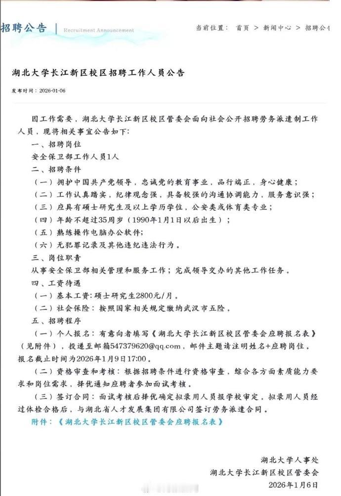 月薪2800保卫岗要硕士学历,硕士站岗月薪2800?湖大这波操作把“内卷”玩成黑色幽默 湖北大学一则招聘公告,直接把当代年轻人的就业焦虑干成了搞笑段子——安全保卫部招人,门槛卡死硕士学历,基本工资却只给2800元,主打一个“高学历配低保底”的魔幻反差。网友锐评:“读了二十多年书,终究是为了月薪2800看大门”,精准戳中笑点与痛点。 校方紧急灭火,称是管理岗非一线保安,实际工资更高。可问题是,招聘公告藏着“文字游戏”,既不写清管理岗具体干啥,也不公示综合薪酬,反倒让“硕士保安”的梗越传越疯。这波操作堪比“用燕窝的标准选食材,用白菜的价格结账”,把学历通胀的荒诞感拉满。 如今高校行政岗卷到离谱,图书馆、后勤岗都要硕士打底,仿佛学历成了唯一KPI。可薪资跟不上门槛,本质就是让人才“屈才换稳定”。网友调侃“卷不动了,不如去湖大当硕士保安,主打一个知识站岗”,玩笑背后全是对人才错配的无奈。 与其搞模糊招聘制造争议,不如把薪资、岗位职责说清楚。毕竟,再卷的学历门槛,也架不住月薪2800的现实暴击,别让高学历人才,沦为招聘乱象里的搞笑谈资。